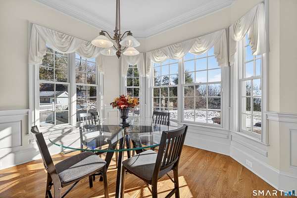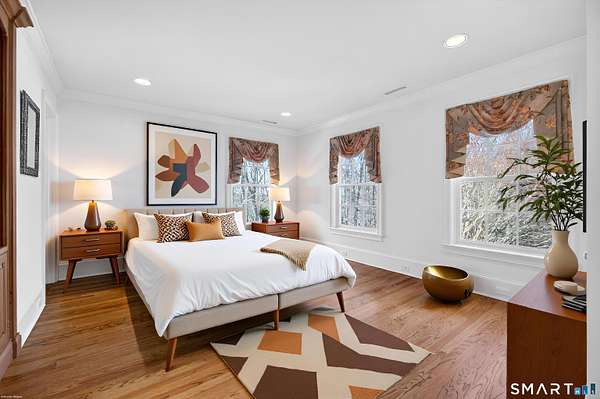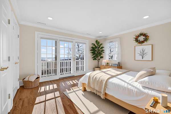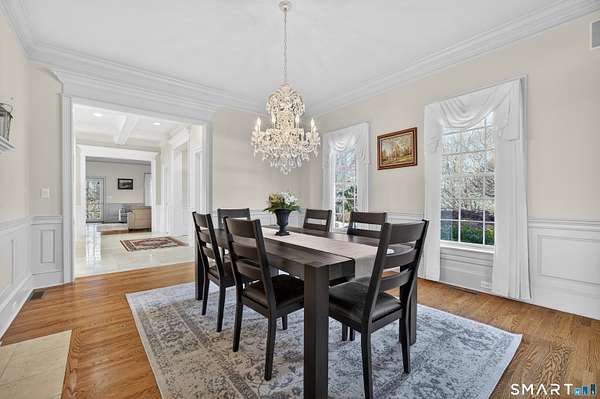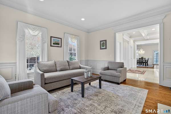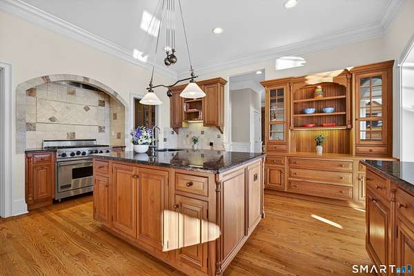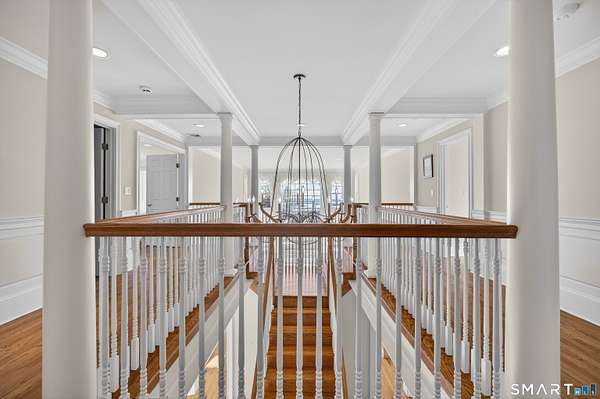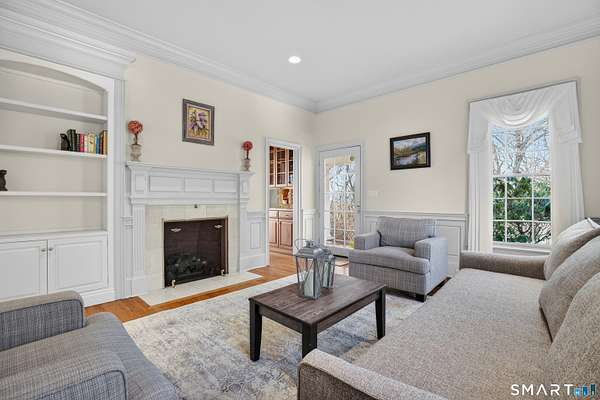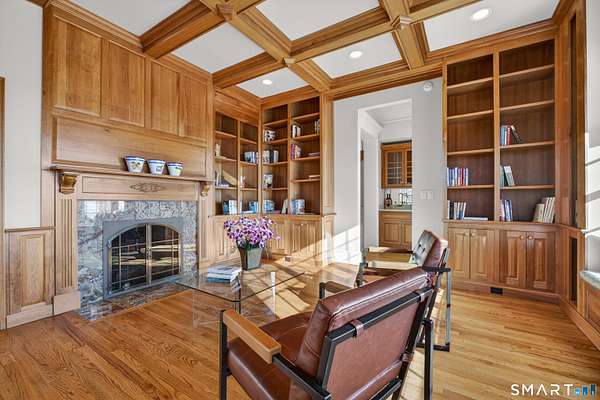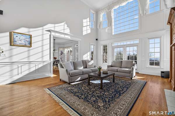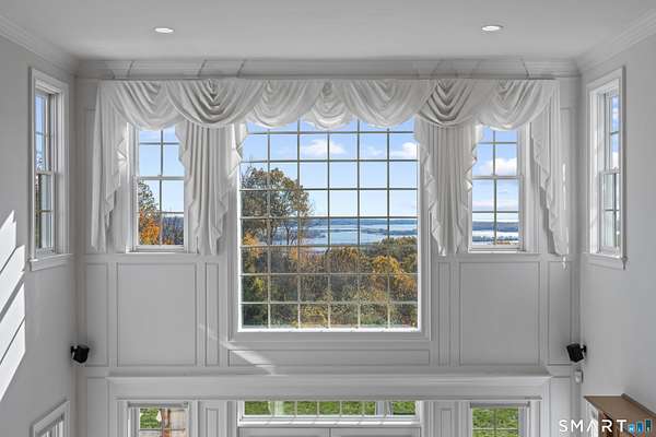 Commanding one of the highest and most breathtaking viewpoints in Essex, Eagles Peak offers this custom-built Georgian Colonial where elevated Connecticut River and Long Island Sound views take center stage. Privately sited on 9.26 acres, this exceptional estate offers rare seclusion, architectural distinction, and extraordinary water views visible from many principal rooms. Encompassing approximately 7,400 square feet, the home welcomes you with a dramatic handcrafted coffered-ceiling foyer and sweeping center staircase, drawing the eye toward a spectacular great room with 19-foot ceilings and a wall of windows capturing uninterrupted river and shoreline vistas. Throughout the home, fine craftsmanship is on full display, highlighted by extensive custom cabinetry and built-ins. The chef's kitchen, finished entirely with solid cherry cabinetry, features a Viking range, Sub-Zero refrigerator, dual dishwashers, and generous space for gathering and entertaining-all while enjoying the home's elevated water views. A richly appointed custom built library with fireplace and floor-to-ceiling bookcases creates a warm and inviting retreat. The second level offers a luxurious primary suite with sweeping river views, along with four additional en-suite bedrooms. One bedroom is currently configured as a private office and offers in-law or guest suite potential with a separate entrance.