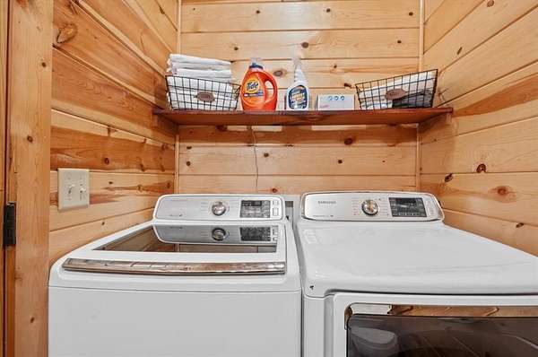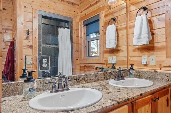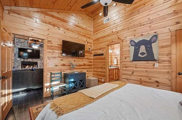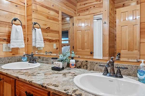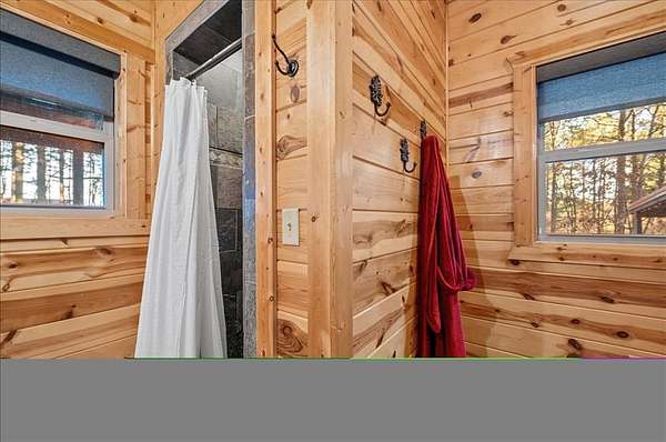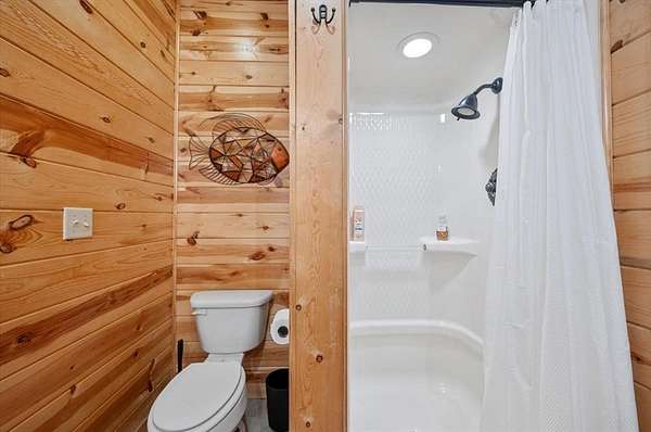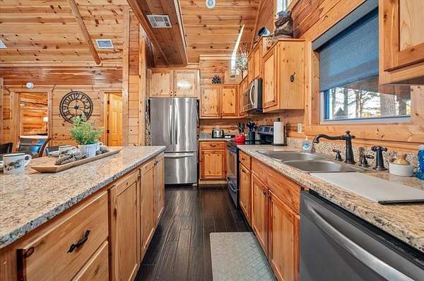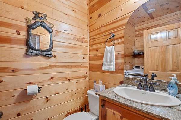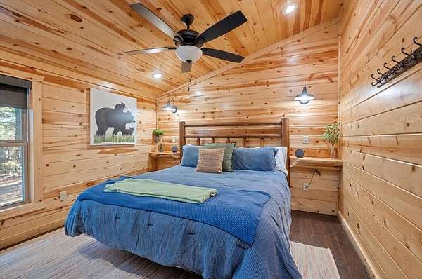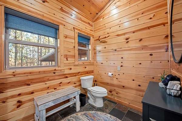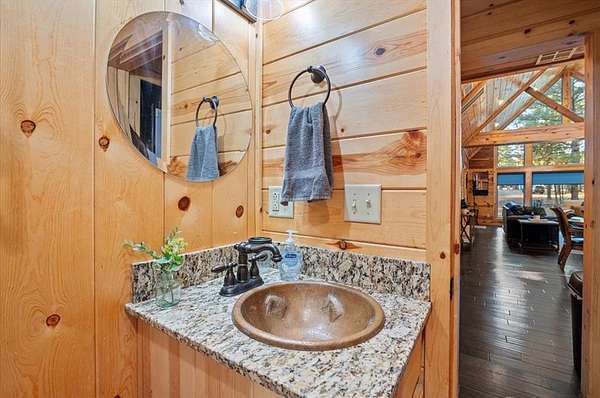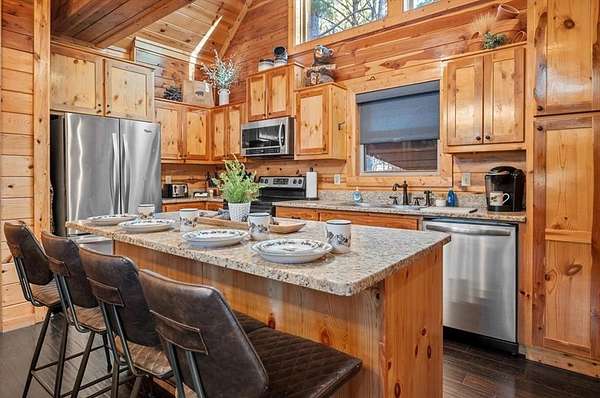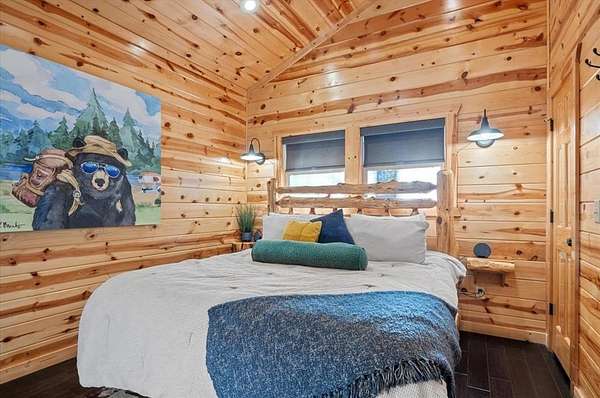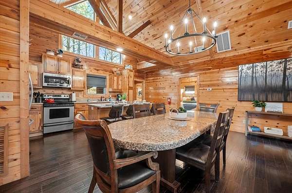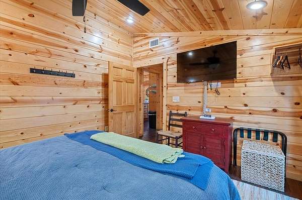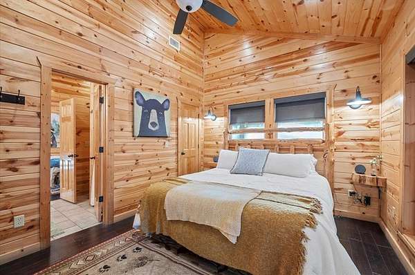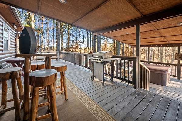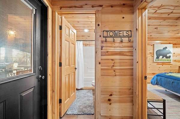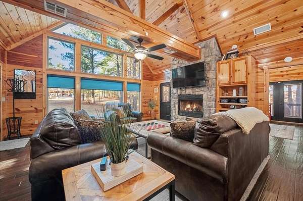Experience this terrific traditional 4-bedroom, 3.5-bath cabin with a beautiful copper roof. Lot 1 has a total of 2.07 acres. This lot has been split to offer the advantage of building another STR cabin on it!! The surveyed split allows 0.58 acres to be used for another cabin build. The current cabin sits on 1.49 acres that exudes a cozy, rustic charm with a beautiful stone fireplace in the living room and a stunning wall of windows that bring the outdoors in. The open floor plan creates a welcoming flow, and the kitchen is equipped with sleek stainless steel appliances. There's ample dining space, including an island with seating for 4 and a dining table for 6. Sleeping 8 guests comfortably, the cabin also features a convenient half bath. There's plenty of room to explore, horseshoe pit for outdoor fun, plus a playset for the kiddos. Guests can relax around the firepit in Adirondack chairs or unwind on the spacious covered deck, which also features a brand-new hot tub. Perfect for families and groups this cabin makes a great STR with a perfect location. Fishing Bear is nestled in the heart of Hochatown, just minutes from popular spots like Grateful Head Pizza and Girls Gone Wine.