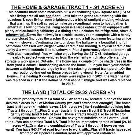JOIN US FOR AN ON-SITE AUCTION PREVIEW THURSDAY - MARCH 5TH FROM 5:00P.M.-7:00P.M. --- ABSOLUTE AUCTION SATURDAY - MARCH 14TH, 2026 - 10:30A.M. --- ESTATE OF JOHN J. DONNELLY --- 3 BEDROOM/2 BATH BRICK HOME --- w/ 24' x 28' DETACHED GARAGE --- 29.32 ACRES (+/-) IN 9 TRACTS --- HOME TRACT - 6 RESIDENTIAL TRACTS & 2 LARGER TRACTS ALL IN THE LORETTO AREA! --- 1340 SPENCER HAMILTON ROAD LORETTO, KY 40037