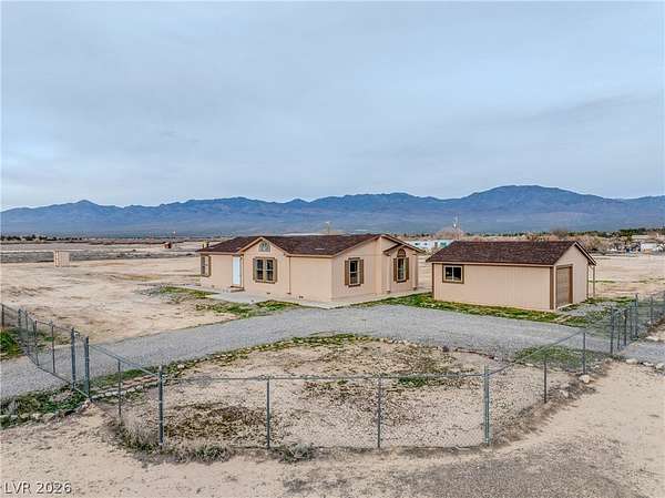 Newly refurbished manufactured home on over 2 acres in the desirable north end of Pahrump, just an hour from Las Vegas and minutes from local stores and services. With only a handful of nearby homes, the property offers generous space and wide-open surroundings. The land is fully enclosed with chain-link fencing and includes two RV gates, ideal for large vehicles or recreational equipment. Inside, the home features 3 bedrooms, 2 full baths, and extensive updates including new flooring, a new roof, fresh paint, and upgraded fans and light fixtures. A screened-in back patio provides a comfortable outdoor retreat, while sidewalks around the home add convenience and accessibility. The approx. 480 sq ft garage includes a partitioned workshop and built-in workbench, perfect for projects or storage. With its private well and septic system, this move-in-ready property blends modern improvements with the freedom of spacious Nevada living. Last but not least this home is not in the flood zone.