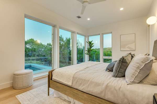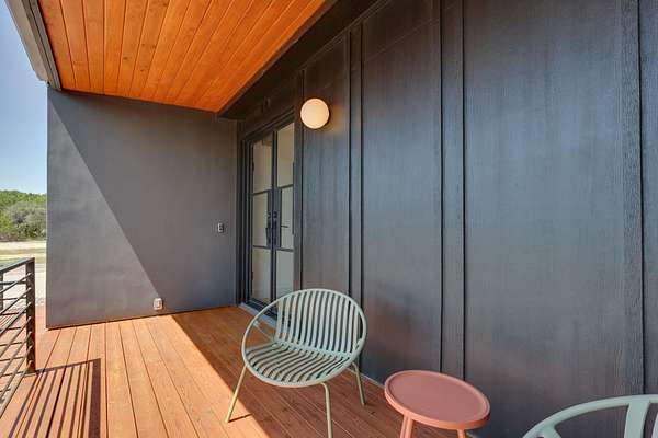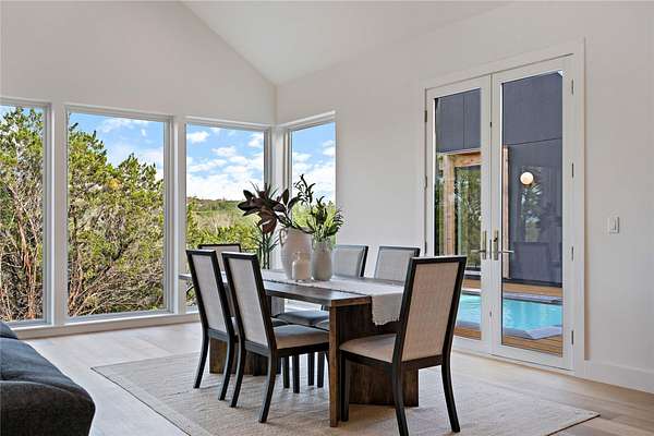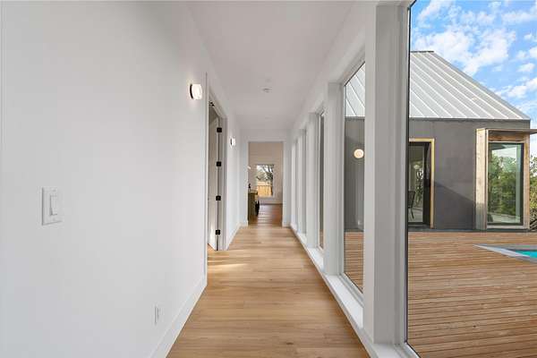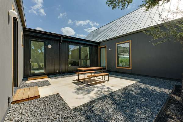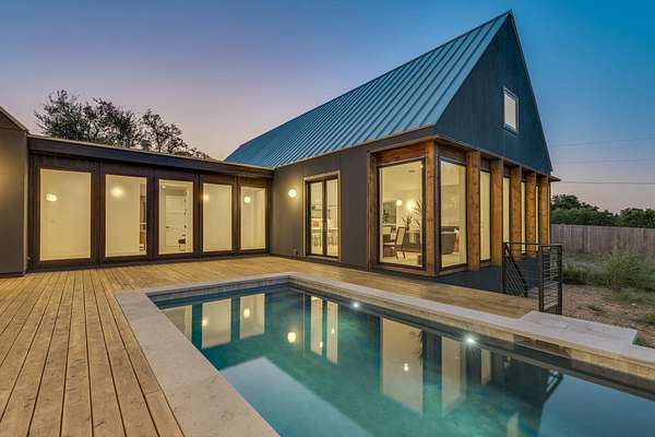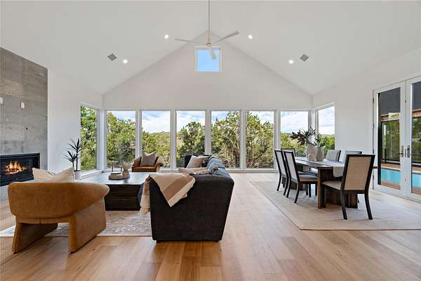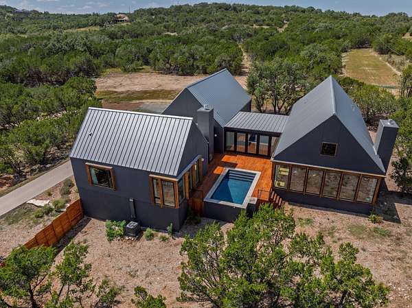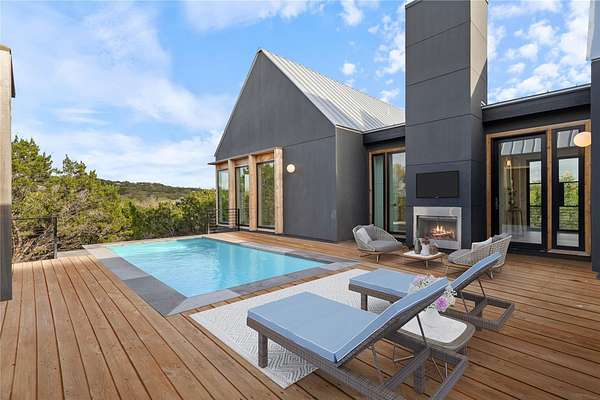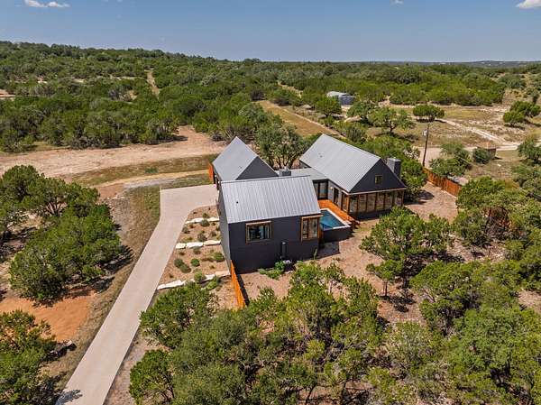 Welcome to this Mid-Century modern home, an impressive example of new construction that beautifully blends contemporary design with classic farmhouse elements. This single-story home features dramatic walls of windows that flood the interior with natural light, complemented by a sophisticated stucco exterior and sleek metal roof. Inside, you'll find four spacious Bedrooms &/0r Study and three and a half Bathrooms arranged in a thoughtful, open floor plan. The property boasts an oversized three-car Garage, providing ample space for vehicles and storage. Step outside to discover a private oasis with a sparkling pool, outdoor fireplace and private yard, perfect for both relaxation and entertaining. Site plan to add Guest House at end of driveway is an optional addition. This exceptional residence is one of just four homes in an exclusive and secluded private enclave, offering the prestige of an Austin address with close access to S. Austin, Belterra and the Fitzhugh corridor, while being served by the highly-rated Dripping Springs schools. Homeowners will appreciate the financial benefits of a low tax rate and connected to MUD water. With no HOA restrictions, you're free to personalize this extraordinary property to your exact preferences, making it truly your own Retreat. Can have 1 horse/ 1.5 acres. Additional 3 acre lot available for purchase. Standard Texas Builder Warranty 1-2-10 conveys.