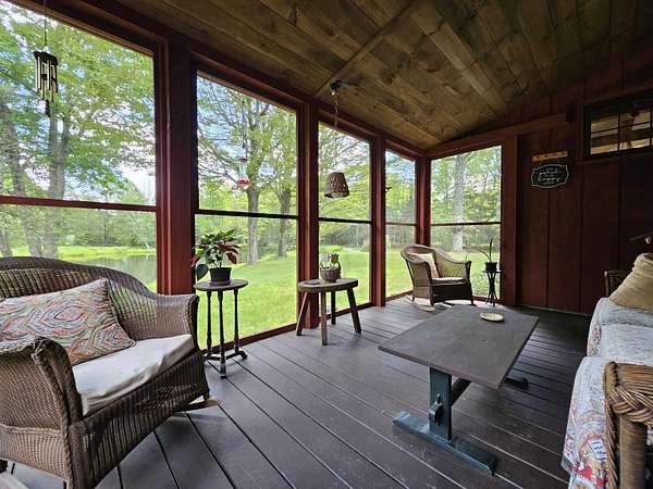 Welcome to your own private retreat--98 acres of Vermont beauty offering meadows, woods, two ponds, and eight versatile outbuildings. Thoughtfully maintained, this charming home is nestled in a park-like setting complete with long, historic rock walls, mature trees, and lovely perennial gardens. Nature lovers will appreciate the abundance of wildlife, from hummingbirds and ducks to deer and the occasional moose wandering past the apple trees and blueberry bushes. Step onto the screened porch overlooking the main pond, perfect for morning coffee or evening relaxation. Inside, warm wood floors and exposed beams enhance the home's country elegance. The open-concept living and dining area flows into a light-filled kitchen with floor-to-ceiling windows framing views of a mountain you own. The home features two nice-sized bedrooms and two full baths, offering comfort and practicality. Additional amenities include a large pantry/laundry room and easy access to a full concrete basement, ideal for storage or workshop space. Beyond the home, wooded trails lead to the back acreage and a hidden, spring fed pond perfect for secluded swims. There's subdivision potential, with 14+ acres already surveyed across the Grafton line--an investment opportunity or space to expand your vision. Perfectly situated between the charming villages of Chester and Grafton, this is more than a home, it's a lifestyle.