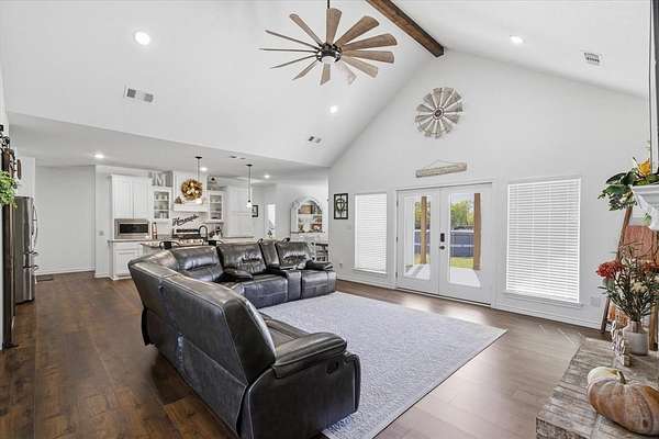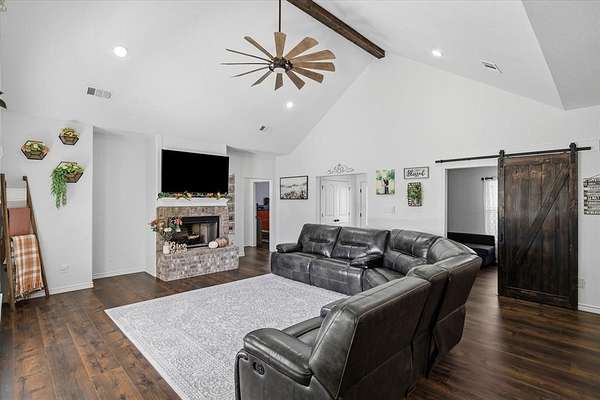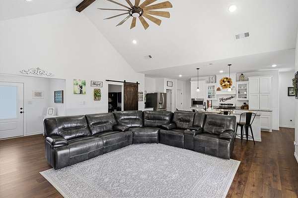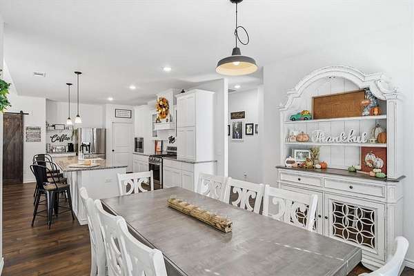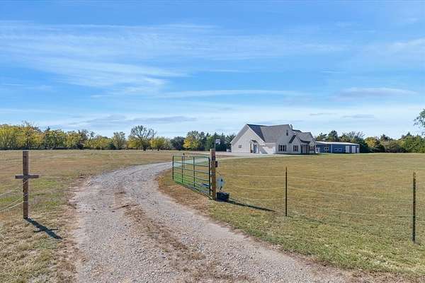 Beautiful country home on approximately 9.5 acres located in desirable Wills Point ISD. Property features a gated entrance, pond, and large shop with workspace and entertainment area with full bath. The well-designed split-bedroom floor plan offers an open living and kitchen area with vaulted ceilings, wood flooring, and plenty of natural light. Spacious primary suite includes dual vanities and walk-in his and her closets. Enjoy peaceful country views from the covered porch and mature shade trees throughout the property. Conveniently located near Hwy 80 for easy access to town. Perfect setup for a small ranch, home business, or anyone seeking quiet country living with modern comfort.