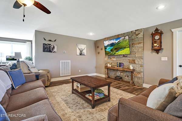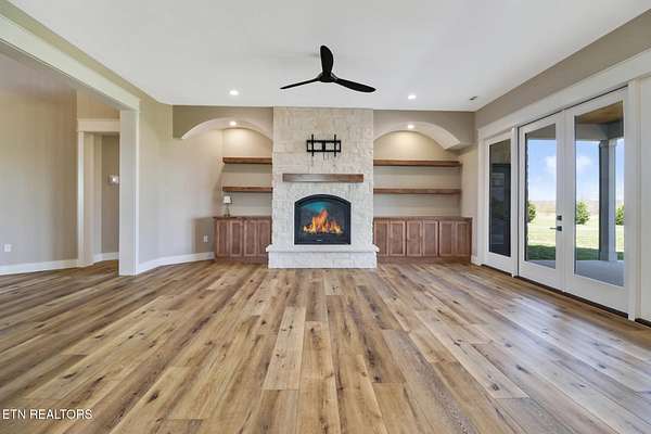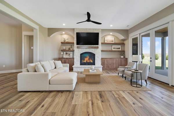 LIVING ROOM: showcases a stone gas fireplace with custom built-in shelving with access out to the covered back porch and patio ideal for entertaining.