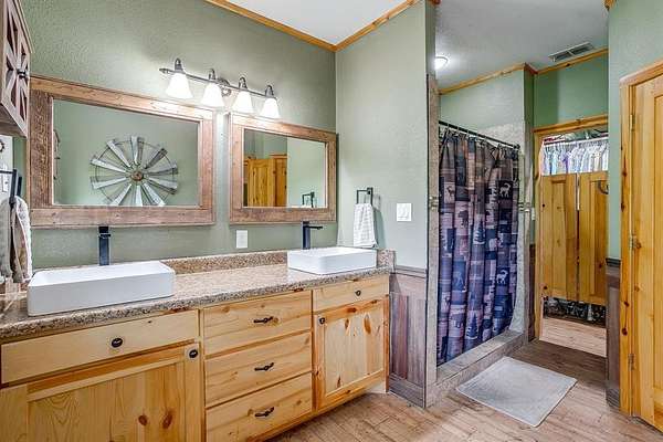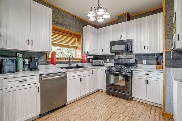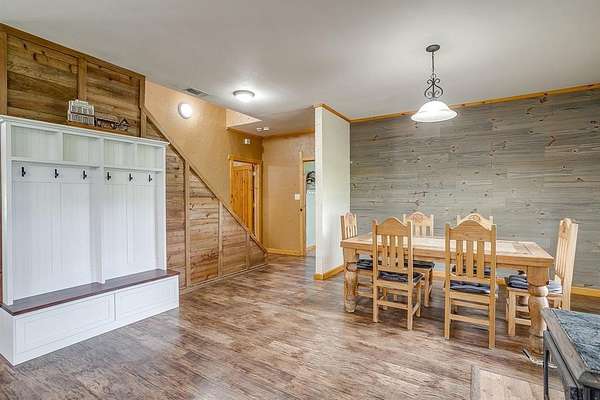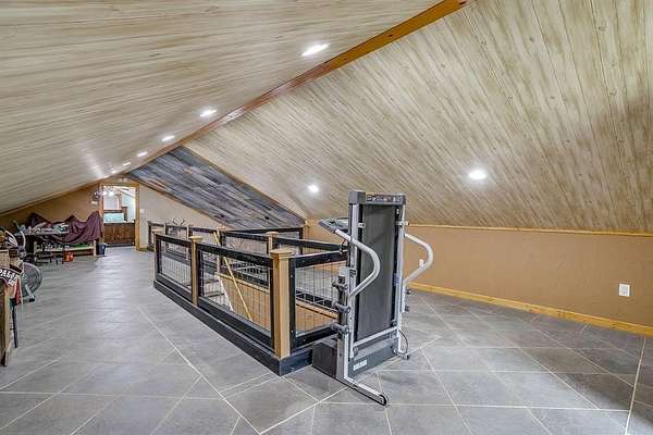 Step inside to an inviting open-concept layout with rustic finishes and vaulted metal ceilings in the living room. The spacious kitchen is built for everyday living and entertaining, offering crisp white cabinetry, expansive counter space, stainless appliances, and a breakfast bar that flows into the dining area. Multiple bedrooms and a large upstairs flex loft give you room for guests, office, bunk space, or a game room.