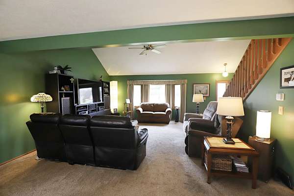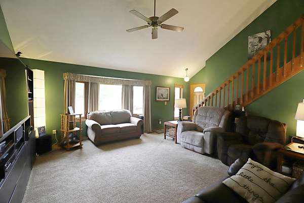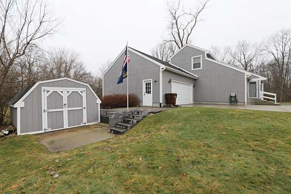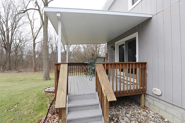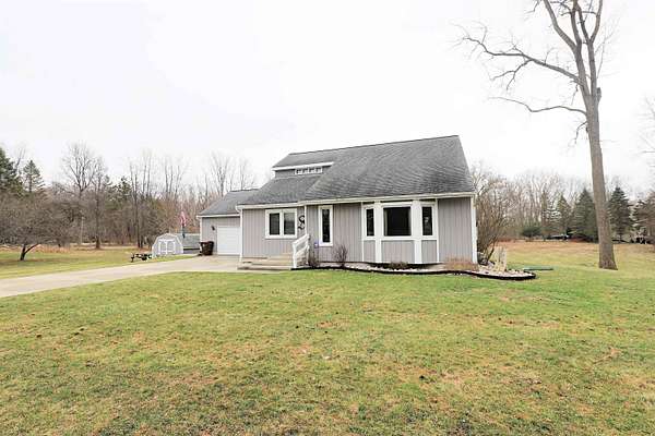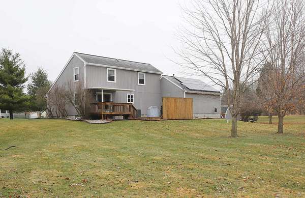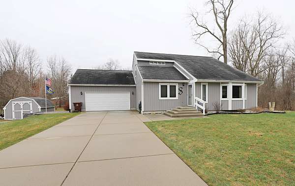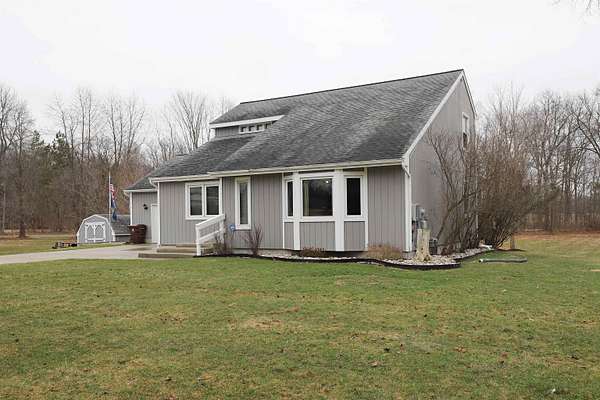 Step into modern contemporary elegance with this immaculate custom-built home set on nearly 2 acres, with apple trees and a cul de sac setting. Just minutes from I-69, this home boasts a main floor primary suite and first floor laundry. State of the art stainless stove (1 yr) and refrigerator with ice maker (1 yr) equip this efficient kitchen. Open floor plan for cathedral ceiling great room/dining area with newer vinyl windows (10 yrs) provides comfort plus. Many recent updates include newer furnace (2025), central air (2025), water softener (1 yr), garage opener (2026), bathroom (7 yrs), entry and garage doors (3 yrs), sump pump (2 yrs), deck, and extra wide cement driveway. Relax and watch the wildlife from the covered deck with newer hot tub. Home has energy efficient 2x6 construction with cellulose insulation and solar panels (2 yrs) on top of garage. 2 driveways service the extra wide driveway and an outbuilding with foundation and electrical. Don’t miss this one!
