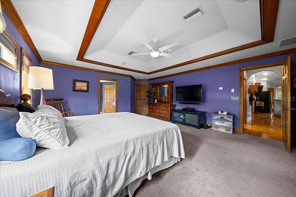 - Built-In Features, Cathedral Ceiling(s), Ceiling Fans(s), Crown Molding, High Ceilings, Open Floorplan, Pest Guard System, Primary Bedroom Main Floor, Solid Surface Counters, Split Bedroom, Thermostat, Tray Ceiling(s), Walk-In Closet(s)