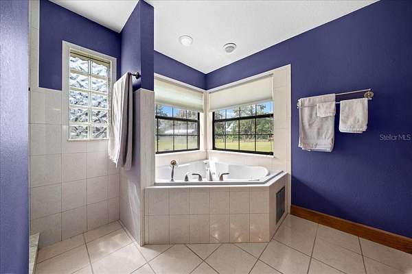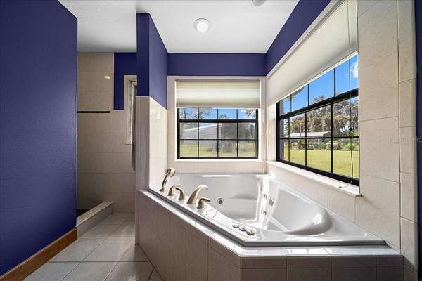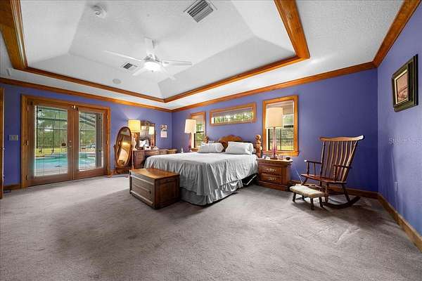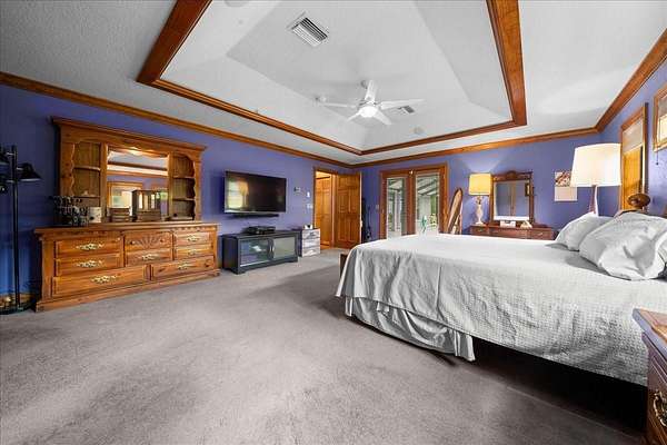 The private owner’s suite serves as a relaxing retreat with a tray ceiling, built-in speaker system, French doors to the pool, and a spa-inspired bathroom complete with Jetta Stone countertops, a luxury jetted soaking tub, and a separate walk-in shower.