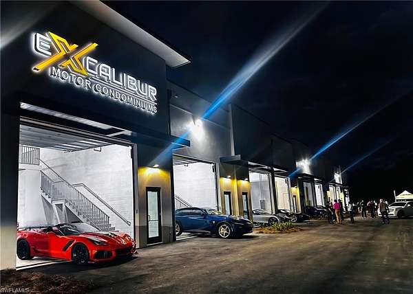 Excalibur Motor Condominiums offers many unique and robust standard features that are superior to most other 'storage facilities' in SWFL, at a lower price point, and that has made us one of the safest and best solutions in our market. Unit 119 is one of our standard units which offers a total of 1350 SF; that includes a 25x40 SF first floor and a 320 SF Mezzanine that sits 14 FT above the first floor, that can act as a Man-Cave or a She-Shed to gather with friends or an office away from home. Excalibur is an 100% concrete building rated for 170+ MPH wind. It is built 20 ft above sea level, in FEMA Zone-X out of the coastal flood zone, so in case of another hurricane like Ian or Milton, your valuables will be safe. It also includes multiple security measure such as 8FT Fence all around the parameter, 2 point of entry with cameras, with security lights and additional cameras strategically located all around the development that record all activity 24/7. Each unit has individual climate control bolted to the roof, a Full Bathroom including shower, 220V / 200 AMP power in each unit, 16' wide x 14' tall segmented and insulated custom garage door as well as insulated impact glass entry door to allow light into each unit. To facilitate the use of these units as office, each unit has its own address that can receive mail or parcels. Each unit also includes its own high speed internet connection and includes plumbing and drain on the second floor to facilitate addition of a wet-bar or kitchen. Our fully concrete buildings are equipped with single-ply TPO roofing, renowned for its superior longevity and energy efficiency. In the Second Phase we have larger units that are also available anywhere from our '1.33 Unit' which is 1,800 SF, to our '53 Footer' that is 1,695 SF with the first floor being 53 FT x 25 FT for RV owners, to our 'L-Shape Unit' with 2 garage doors, which allows creativity and additional room for toys at almost 2,000 SF and our deluxe Double Unit which has a total of 2,700 SF. The Developer is also willing to work with you while in construction to create a unique unit that best fits your needs. Every unit comes standard with all the amenities mentioned above. All this makes Excalibur the most unique and one of the safest development in SWFL to keep your luxury items and provide the owners with an absolute peace of mind.