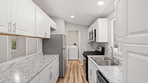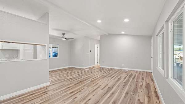 Turnkey, remodeled home with mountain views! Welcome to 13490 Highway 8 Business #8 in Lakeside. This bright, open 3-bedroom, 2-bath home features vaulted ceilings, recessed lighting, and brand-new vinyl flooring throughout. The updated kitchen offers modern cabinetry, new appliances, and ample counter space, while both bathrooms have been stylishly remodeled for a fresh, contemporary feel. The split floor plan provides privacy, with the primary suite featuring its own en-suite bath. Additional highlights include a large laundry room, central A/C and heat, dual-pane windows, and a newer roof. Step outside to enjoy the oversized porch with scenic mountain views, a freshly mulched yard, and a storage shed. Located in a welcoming, family and pet-friendly community with a pool and clubhouse, this home offers the perfect blend of comfort, privacy, and convenience--just minutes from shopping, dining, schools, and freeway access.