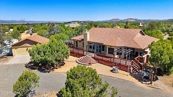 Unique Opportunity! Explore this spacious horse property with 3 car garage attached, PLUS a 2 car garage and shop, PLUS 2 barns with turnouts, round pen, tack room, storage, 2 small greenhouses, several storage sheds. All included on 4 acres with Granite Mountain Views! The well built home has 3 bedrooms, an office/bonus room and formal dining room. Great room with wall of windows looking on to back of property. Vaulted ceiling, fireplace with brick facing. Chef friendly kitchen has knotty alder cabinetry, Sub Zero appliances and a huge walk in pantry. The back deck runs the length of the home and includes 3 pergolas, built in BBQ. Perfect for entertaining or just enjoying the quiet view. Plenty of room for RV parking. Ride from home to several trails. Price reduced to sell AS IS. Inspection report and list of repairs available. Priced well below comparable properties. .