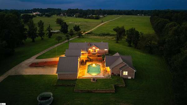 Welcome to Glendarosa Farms -- an extraordinary 87+- acre sanctuary nestled in the heart of South Carolina's Upstate. This one-of-a-kind property blends timeless charm with modern sustainability, offering an unparalleled lifestyle for animal lovers, nature enthusiasts, or anyone seeking privacy and peace away from the chaos of modern life. The Residences: The primary residence is a turnkey all-brick ranch home featuring 5 bedrooms, 4 bathrooms, and a spacious deck overlooking a gleaming pool, and guest house. Designed for energy independence, the home is powered by 52 solar panels and 3 Tesla batteries, making it remarkably efficient and ideal for off-grid living. Step inside to a warm, family-friendly atmosphere where large picture windows bathe the space in natural light. The newly remodeled kitchen boasts wraparound quartz countertops and a central island, with long views of the grazing pastures dotted with Scottish Highland cattle, sheep, and goats. The adjacent dining room flows seamlessly into the living room, anchored by a cozy brick fireplace--perfect for gathering and making memories. The primary suite offers a generous walk-in closet and en-suite bath, while three additional bedrooms and two full bathrooms provide ample space for guests or growing families. Downstairs, the fully finished walk-out basement includes a large laundry room, additional living space, guest bedroom, full bath, and abundant storage. In addition to the primary residence, 4 income producing properties sit on the outskirts of the land. Property 1: 4 bed 2 bath, Property 2. 3 bed 2 bath, Property 3. 3 bed 2 bath, Property 4. 3 bed 2 bath All rental properties have stable/long term renters. Each yard is individually fenced. The Land & Amenities: Outside, the beauty and tranquility continue. Glendarosa Farms features two large barns--one easily convertible into a six-stall horse barn for private use or small-scale boarding. A covered area nearby accommodates large equipment, while the second barn, a full metal outbuilding, is ideal for farm machinery and additional storage. A well-established trail system winds throughout the property, offering scenic routes for hiking, riding, or exploring. A true highlight is the breathtaking, fully fenced 4-acre pond--perfect for fishing, kayaking, or quiet afternoons by the water. Mature trees, rolling fields, and abundant wildlife create a picturesque backdrop in every direction. With many individually fenced fields, the land is well-suited for a variety of animals and agricultural pursuits. Whether you envision a private family farm, equestrian estate, or agri-tourism venue, Glendarosa Farms provides the space, infrastructure, and setting to bring your vision to life. It also presents an ideal opportunity for a conservation easement. Legacy & Location: Unencumbered by restrictions, Glendarosa Farms is a rare gem where value is measured not just in acreage, but in the experiences and memories it cultivates. For over two decades, it has served as one family's cherished home and sanctuary. Ideally located just minutes from Lake Bowen, Downtown Inman, Downtown Spartanburg and an easy drive to Greenville, Landrum, Tryon and Ashville. You're invited to experience Glendarosa Farms for yourself--and perhaps become the next steward of this iconic estate for generations to come.