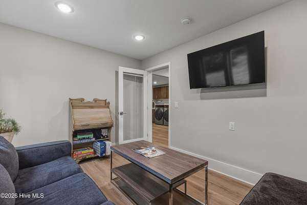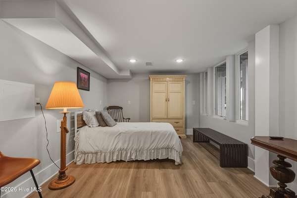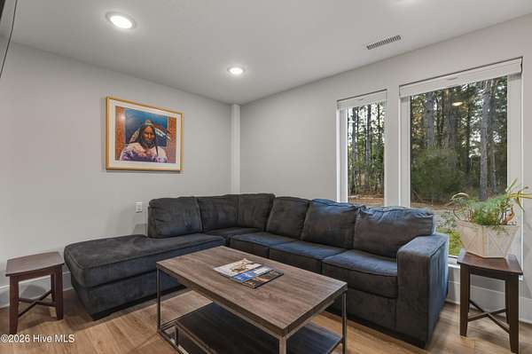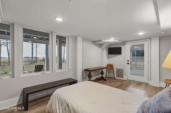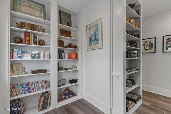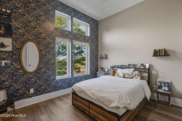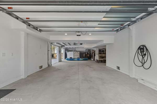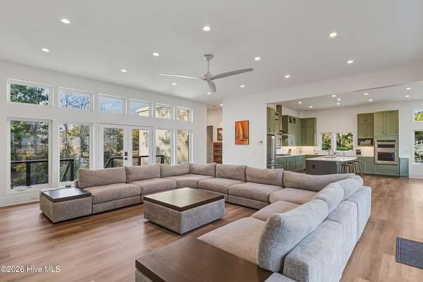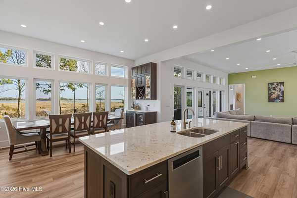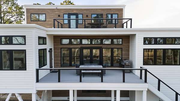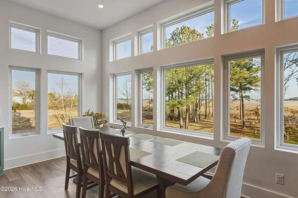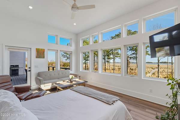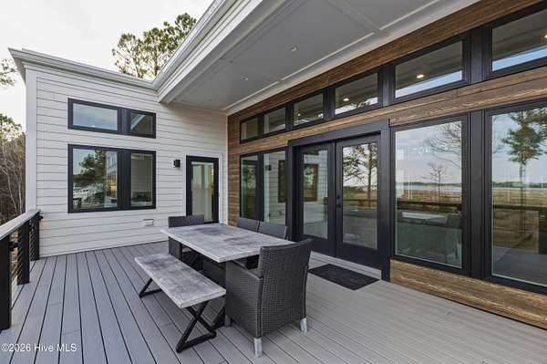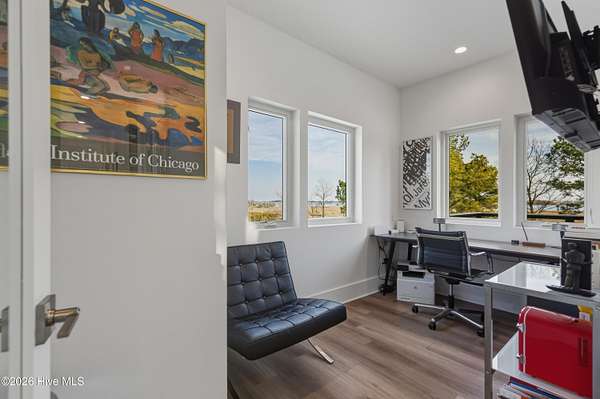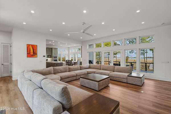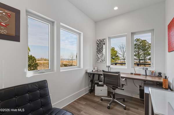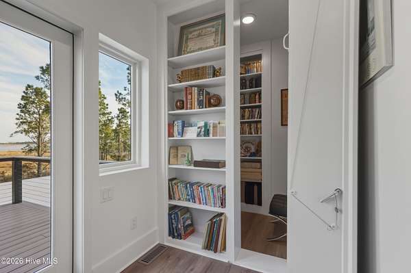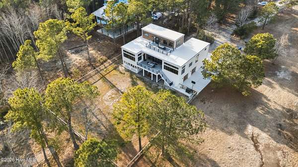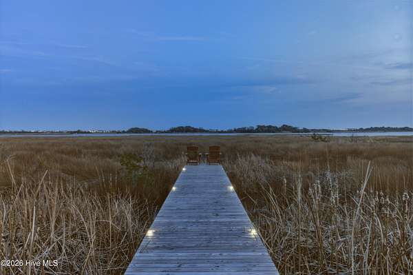Waterfront. Acreage. Custom Design. Perfectly positioned on 3.48 private acres with over 100 feet of direct waterfront on Topsail Sound and convenient access to the Intracoastal Waterway, this architecturally distinctive residence captures expansive water views while offering a rare sense of privacy-all just 4 miles from Surf City beach access with convenient proximity to Surf City's shops, restaurants, breweries, and pedestrian walkways leading to the Surf City Bridge. Designed to maximize both light and scenery, the main living level features soaring 11-foot ceilings, expansive windows overlooking the water, an open-concept layout, and custom gallery-style lighting. The kitchen is thoughtfully appointed with a premium appliance package, custom cabinetry, granite surfaces, double sinks, InstaHot faucet, and a large island ideal for gathering. The primary suite serves as a private retreat with dual walk-in closets, dual vanities, and a spa-inspired custom tile shower with multiple spray features. Three additional bedrooms include a private ensuite and a well-designed Jack-and-Jill layout. The third floor provides exceptional flexibility with two offices, a library lined with walls of custom shelving, a hidden secret room, and a half bath - ideal for remote work, creative pursuits, or quiet relaxation. On the ground level, a spacious 4 car garage with workshop/storage area accompanies a bonus space with two additional rooms, presenting excellent potential for guest quarters or multi-generational living. Outdoor amenities include a 125-foot dock overlooking the marsh with prior approval and estimate to extend for boatable water access, creating additional opportunity for boating and waterfront enjoyment. Built with durability and comfort in mind, the home includes an elevator servicing all three floors, whole-house generator, tankless water heater, Anderson window package, Hardie Board siding, composite decking, EV charging capability, fenced yard and outdoor shower. Extensively upgraded and thoughtfully constructed, this one-of-a-kind waterfront property blends refined coastal design with modern functionality. Ask for the complete Building Specifications and Features list to fully appreciate all this remarkable home has to offer.