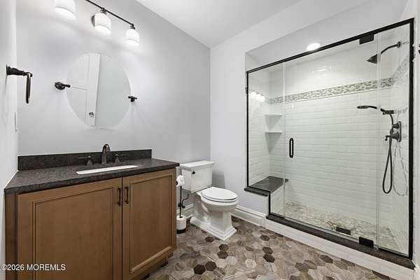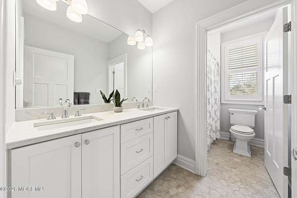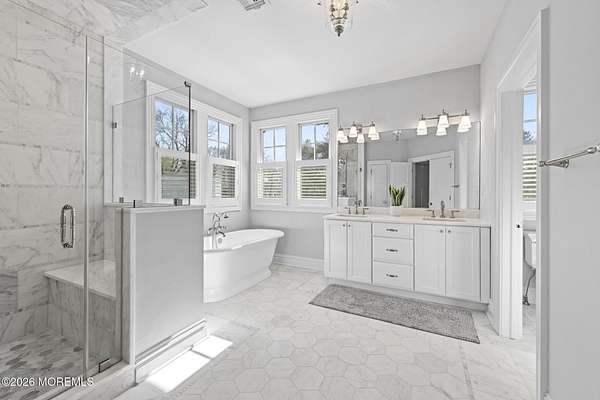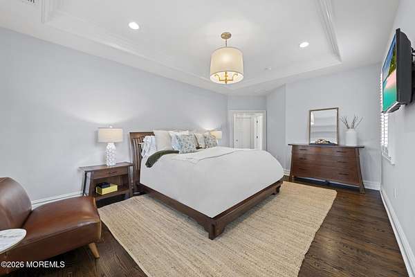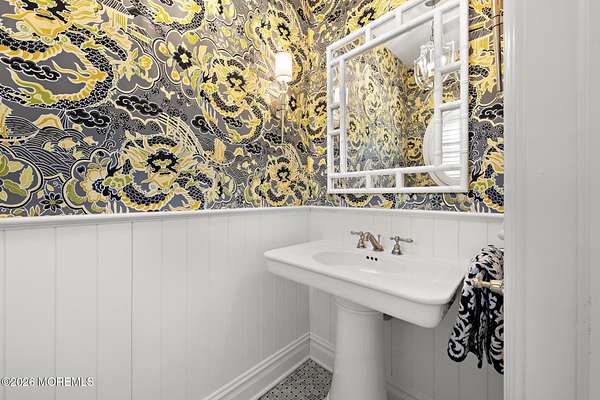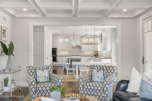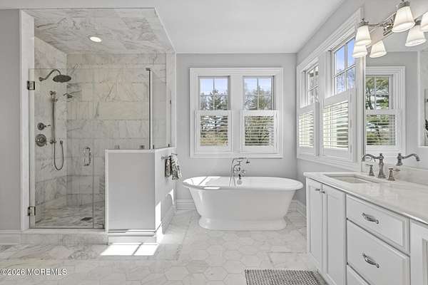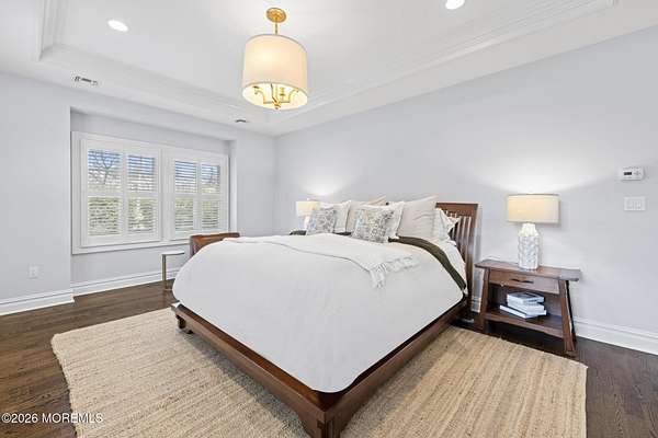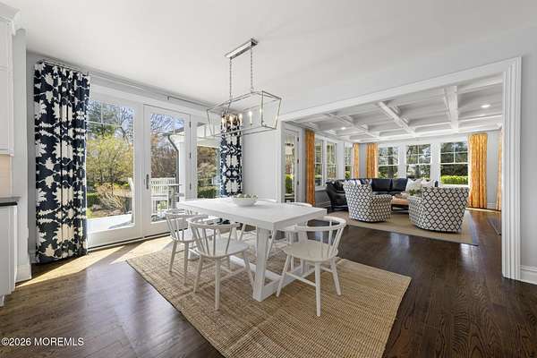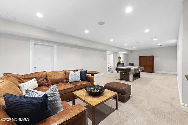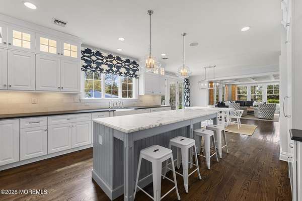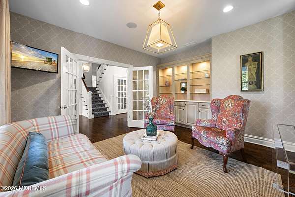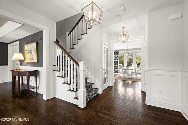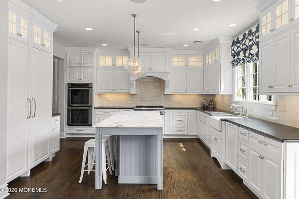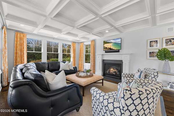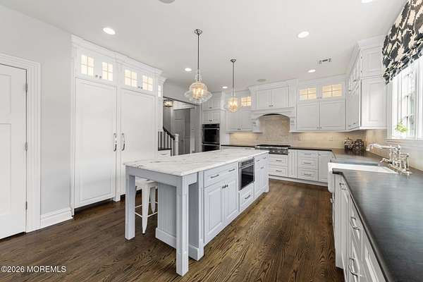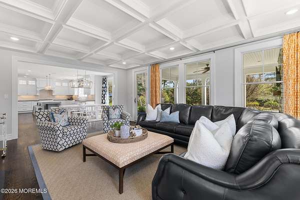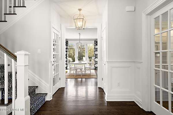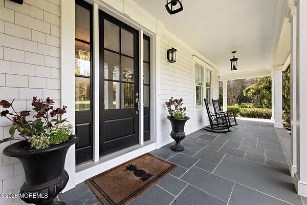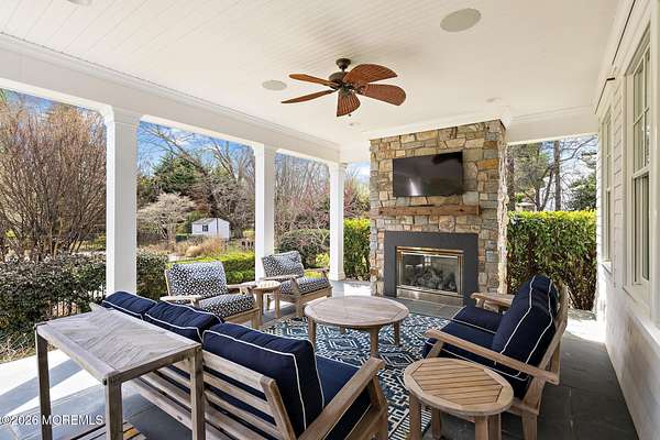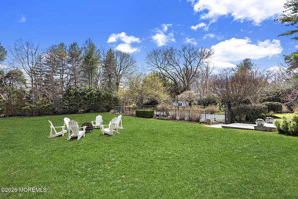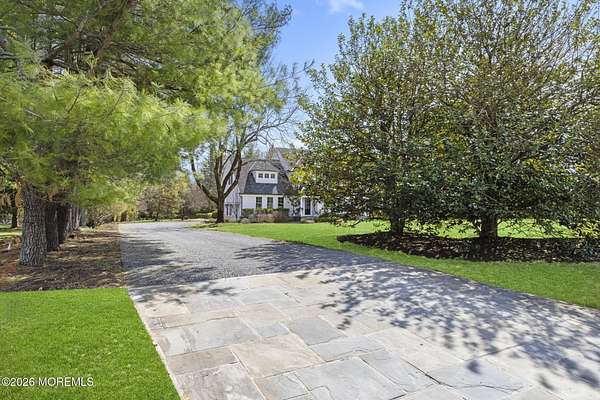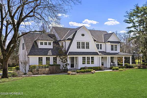 Nestled on 1.63 acres of beautifully manicured, private grounds, this custom 4-bedroom, 4.5 bath home blends refined design with modern comfort. The residence boasts airy, light-filled interiors, 9-foot ceilings on both levels, and exquisite decorative moldings and ceiling details. Custom plantation shutters complete each bedroom. At its center, a stunning open kitchen with high-end appliances and marble countertops flows seamlessly into the spacious family room and out to a covered porch creating an effortless connection between indoor and outdoor living. The home includes two gas fireplaces and a Sonos sound system, enriching both everyday life and entertaining. A full basement with high ceilings and a 3-car garage enhance the home's versatility and refined design. Outdoors, enjoy a private expansive yard, fully fenced backyard with lush landscaping, a pool, and a covered entertaining area with a fireplace for year-round enjoyment. This exceptional Rumson residence delivers luxury, comfort, and craftsmanship. Ideally located just minutes from the beaches, local dining, top rated schools and convenient access to New York City via NJ Transit or the Seastreak ferry, this home offers a balanced blend of coastal setting and everyday accessibility.
