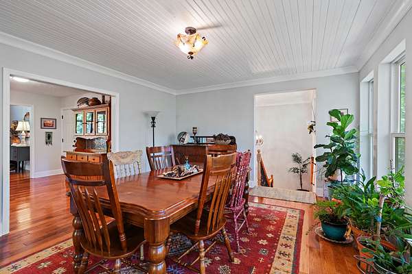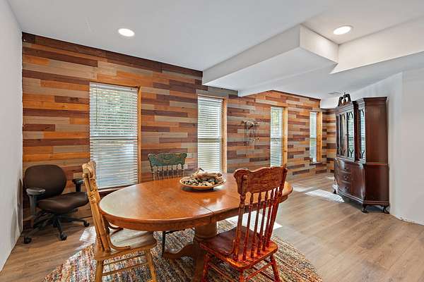 The bright white kitchen shines with timeless appeal, featuring an island with seating and storage that invites conversation and connection. Just beyond, the dining area is surrounded by windows that bring the outdoors in, while shiplap ceilings and warm finishes create an inviting, relaxed atmosphere.