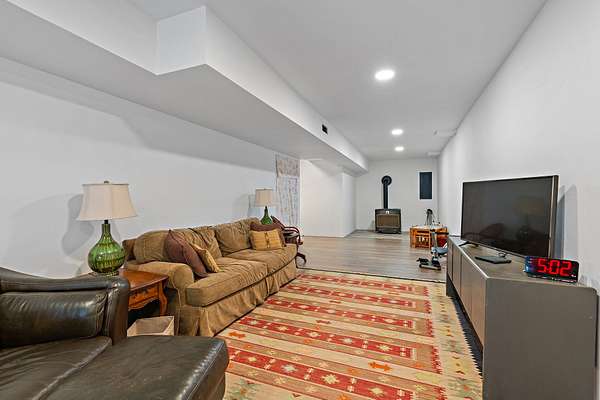 A sleek metal staircase leads to the spacious lower level, offering endless versatility for a second living area, playroom, home office, or gym. The walkout patio below and covered deck above make it easy to enjoy the outdoors from every level.