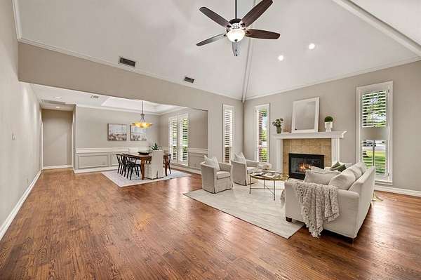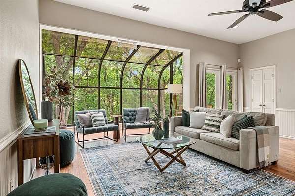 The formal living and dining rooms introduce structure and scale, transitioning into the main living areas. An office with a loft is set within this flow, offering a refined and functional workspace.The master suite is positioned for privacy, where the setting feels most still, with views through the trees and along the water’s edge. The master bath continues that connection, opening toward the pool and open acreage. Three additional bedrooms are arranged along a separate hallway, offering comfort and privacy for family or guests. At the center, a sunroom connects everything, opening directly to the backyard and pool and extending the living spaces outward.