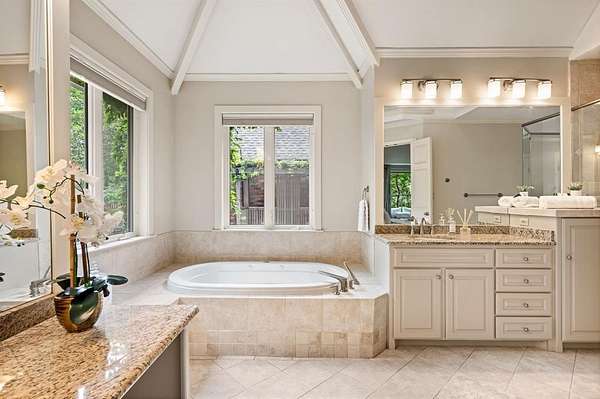 Outdoor living is equally considered. The covered patio, framed by wood beams, overlooks the pool and spa, creating a natural extension of the home. From there, the grounds open across 1.74 acres, with wide lawn and mature trees leading to the water’s edge, giving the setting a sense of scale, privacy, and quiet separation.