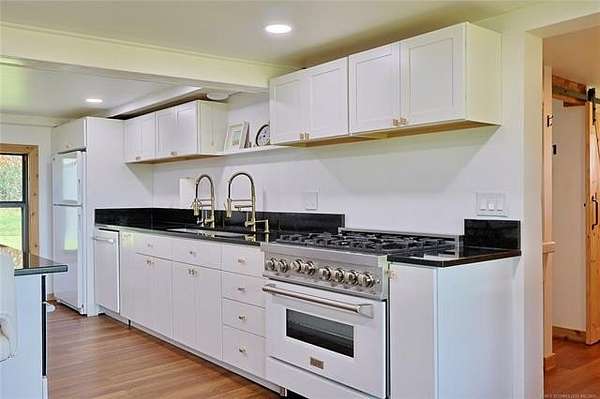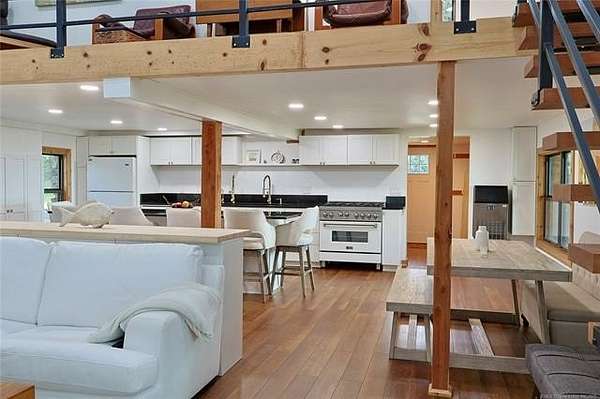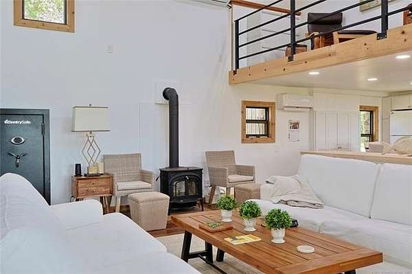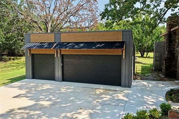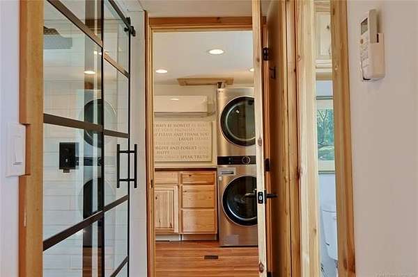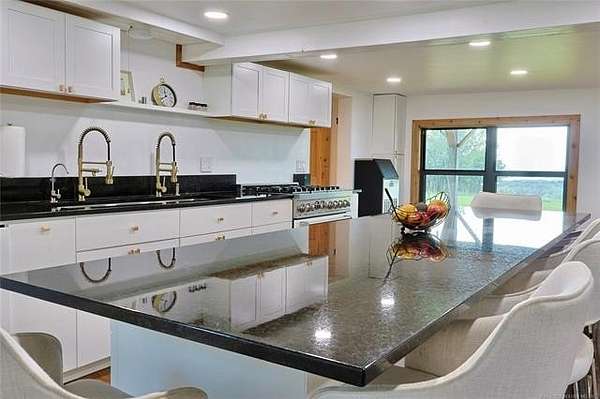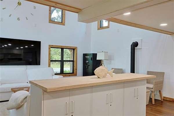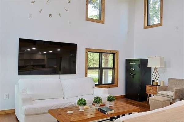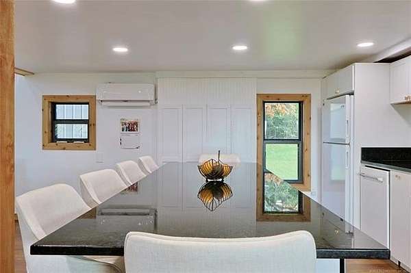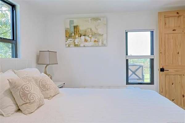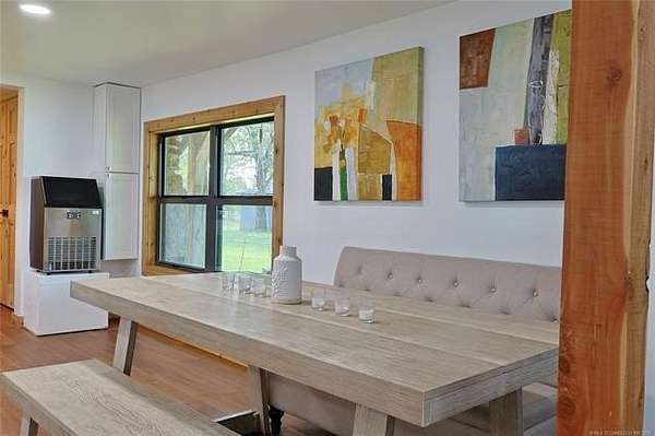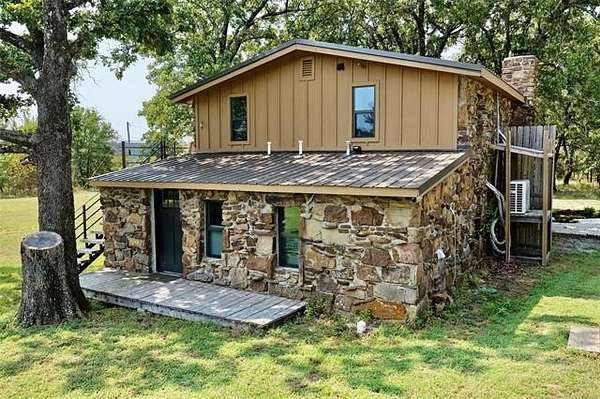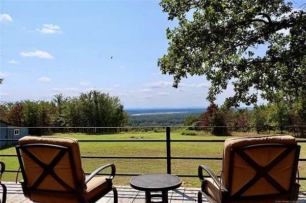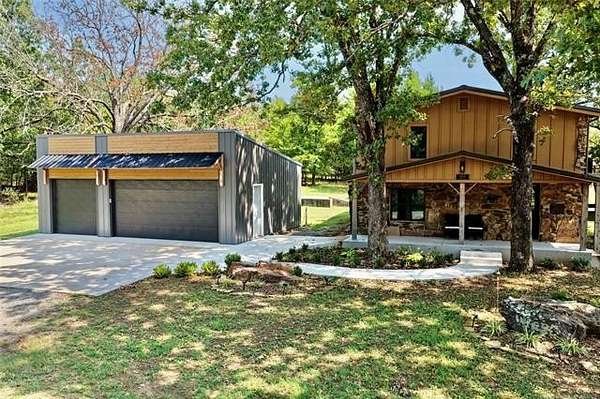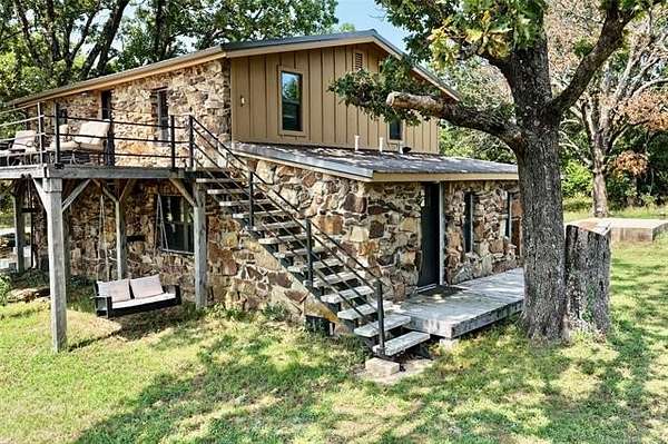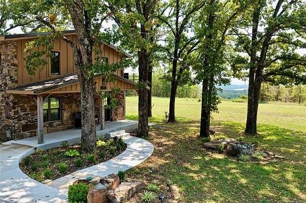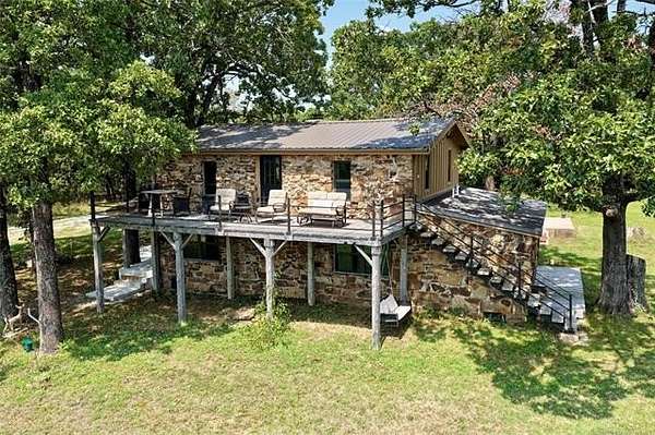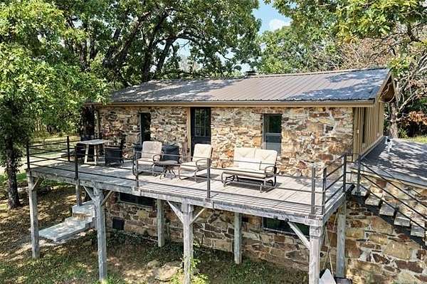 DISCOVER THE PERFECT BALANCE OF MODERN LUXURY AND RUSTIC CHARM! in this fully remodeled rock farmhouse on 20 acres. This extraordinary 1-bedroom home with a loft has been transformed from a 4-bedroom residence into an elegant retreat, featuring an open-concept design with 14-foot ceilings in the living room and breathtaking river views from the dining room, living room, bedroom, and 20-foot deck surrounded by large trees for plenty of shade to keep cool all summer. The state-of-the-art kitchen is a chef's dream, equipped with a six-burner commercial-style propane range, a microwave that doubles as a broiler and convection oven, a 55- inch stainless steel sink with dual gold commercial-style faucets, black granite countertops, and a 10-foot island with bar seating for six. This space is perfect for both everyday meals and grand entertaining. Having great water pressure makes cleaning and showering wonderfully exhilarating. The central vacuum with wall dustpans is a time-saver. A new 3-car garage and a barn with a storage area and a storm cellar. A great hideaway, retirement home, Airbnb, hunting lodge or weekend retreat with high-speed fiber optic Wi-Fi, all in a peaceful setting. Must see to appreciate the efficient contemporary modern rock house. The home is turnkey, with all furniture and decor inside and outside included. Call today to schedule a private viewing and to learn more! Owner is a licensed OK real estate agent.