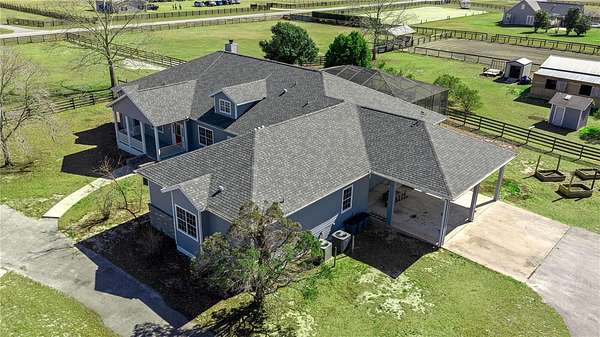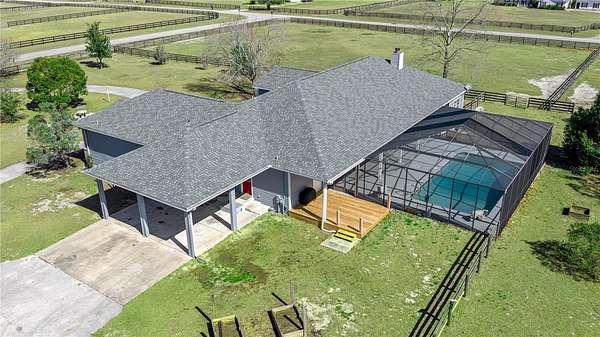 All set up and ready to go equestrian farm on 5.85 gated and fully fenced acres, nestled in the heart of horse country in the small hamlet of Winding Oaks Estates. Thoughtfully designed for serious horse owners and animal lovers alike. This well-appointed property offers a gorgeous 5 bedroom 4 and ½ bath pool home designed for multi-generational living, with an exceptional setup including a 6-stall center-aisle barn with wash rack and air-conditioned tack room; an additional 2-stall barn; a maintained, natural-sand, dressage-size arena, four fenced paddocks (water to two), field shelters, and hay storage, plus a separate workshop/shed with 220V electric. Bring your horses and your mother-in-law! Everything in place and ready to go. The land itself is both functional and serene, featuring apple, peach, and orange trees and a designated wildlife sanctuary area, creating a peaceful balance of productive farm space and natural beauty. Offering over 4300 sf of living space, (see attached floor plan) this impressive estate features a sparkling screen enclosed pool, expansive outdoor living space, and a functional layout for everyday living and entertaining. This home, built in 2001 as a multigenerational home with two Primary Suites on opposite wings features: dual suites with en-suite baths and dual walk-in closets, three additional en-suite bedrooms, a dedicated office/den with built-ins, and a spacious living room with gas fireplace. The large kitchen offers abundant counter and cabinet space, breakfast bar, breakfast nook, and all appliances. A generous utility/laundry room with access directly from the outdoors, features built-in cabinetry, sink, storage closet, and washer and dryer—perfect for active farm living. The equestrian community of Winding Oaks is just 15 minutes from riding trails and horse enthusiasts or hobby farmers will appreciate the proximity to the World Equestrian Center, HITS and other horse venues. There is plenty of room to grow gardens, raise animals, or to homestead. This property delivers the rare combination of a fully equipped turn-key horse farm, privacy, and a comfortable, well-designed home—an ideal setting for training, recreation, and true country living. 2020 updates include: new Hot water heater and Roof. Don't miss this rare opportunity to own a truly unique property. Check out the virtual tours of this amazing property!