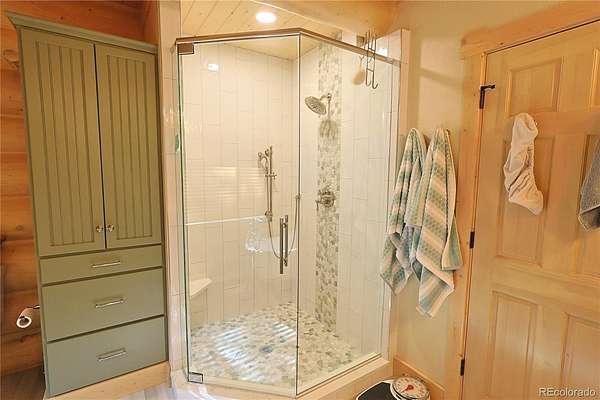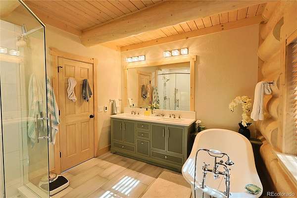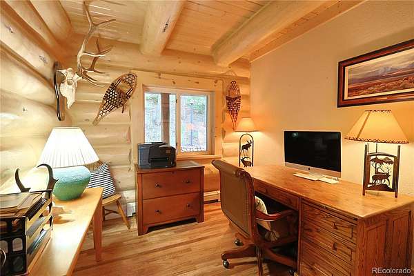 Step inside to exceptional views from the moment you walk in, soaring ceilings, rich log walls, and newly refinished hardwood floors that bring warmth and timeless character throughout. The heart of the home features a cozy living area with wood burning fireplace, perfect for snowy evenings and peaceful mornings. The stair case railing is handcrafted with gorgeous custom forged steel details. The Primary Suite is on the main level, with a sitting room, custom walk-in closet and a Brand-New 5-Piece bathroom, a luxurious oasis and thoughtfully designed with high-end finishes, dual vanities, a walk-in shower, and soaking tub.