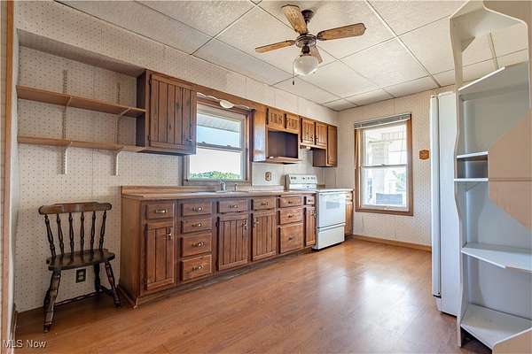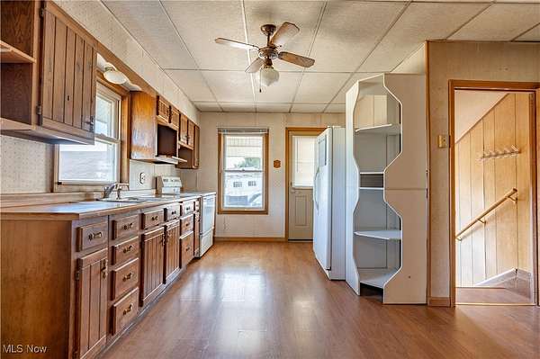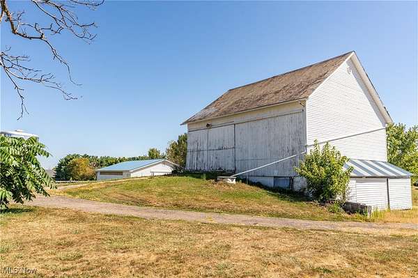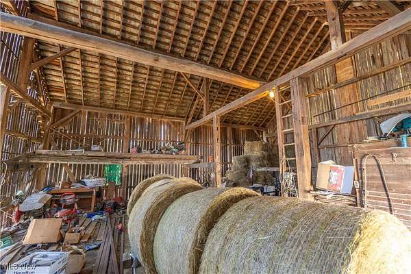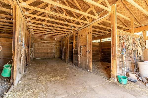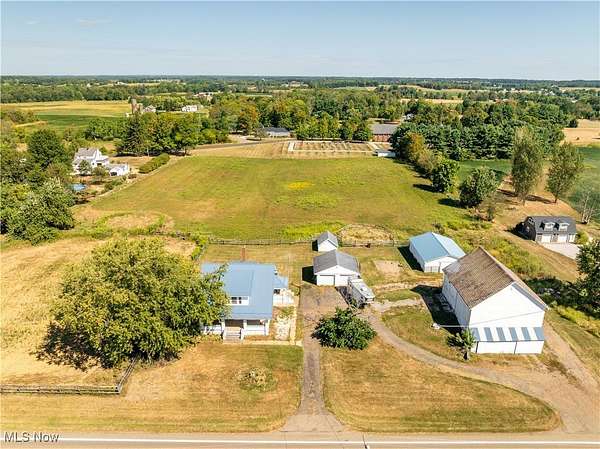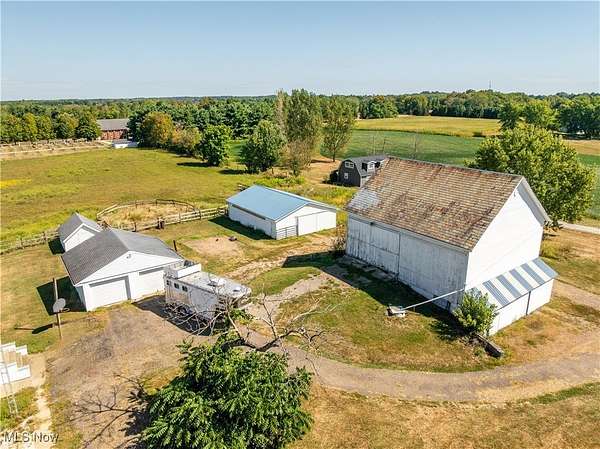 Welcome to this picturesque farmstead, offering over 1,600 sq ft of living space and set on 6.07 beautiful acres. Full of rustic farmhouse charm, this property blends character with functionality and provides plenty of room both inside and out. Sunlight fills the home, highlighting its inviting spaces and timeless details. A covered front porch sets the tone, leading into the great room where tall windows with original trim, a built-in display cabinet, and abundant natural light create the perfect place to relax or entertain. Just off the great room is a cozy family room, ideal for gatherings. The formal dining room features wood floors and a built-in bookcase, while the adjoining kitchen offers generous counter space, ample cabinets, and direct access to the side porch with views of the surrounding land. Step outside to your very own farm. The property includes a large fenced backyard, a sand-and-dirt arena, a storage shed, a 40x30 barn with horse stables, and a 46x34 two-level barn with a cistern system, perfect for hay storage. Horse owners will love the practice arena, ideal for barrel racing or other equestrian activities, and the five-stall stable barn with a tack room, wash station, and direct access to a fenced pen. Back inside, the main level is completed by a full bath with a walk-in shower and relaxing jetted tub. Upstairs, you'll find four bedrooms, including two with walk-in closets and one with a floor-to-ceiling built-in wardrobe. Additional highlights include a full basement with laundry and storage, plus a detached, heated two-car garage with a workbench. Recent updates include a new metal roof. This property is the perfect blend of charm, function, and equestrian appeal. Schedule your private showing today!