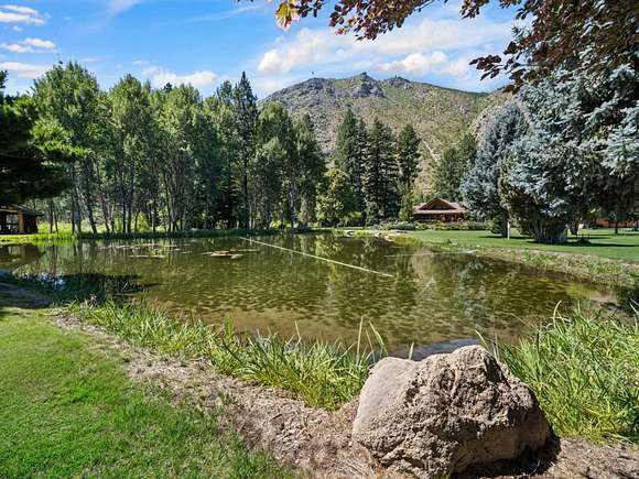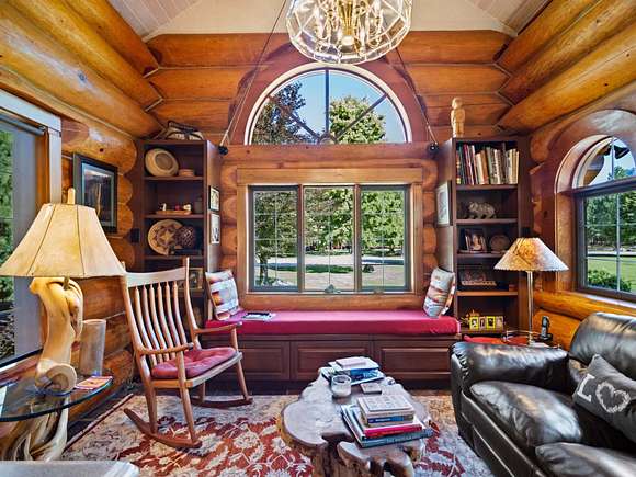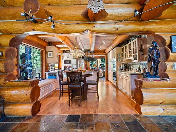Inside, an open-concept living space welcomes you, accentuated by exposed wooden beams and vaulted ceilings that celebrate the log construction. Expansive windows frame picturesque views of the surrounding wilderness, the tranquil Entiat River, and a beautiful one-third acre pond in the front lawn, ensuring a seamless connection with nature even while indoors. The gourmet kitchen is a chef's delight, featuring top-of-the-line appliances, custom cabinetry, and abundant counter space for culinary adventures. Casual dining at the breakfast bar or hosting memorable gatherings in the spacious dining area is a breeze.