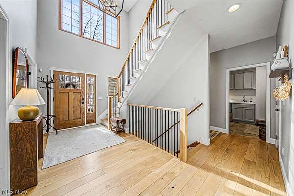 Welcome home to this exceptional Colonial nestled on 1.66 acres. This stunning four-bedroom, three-and-a-half-bath residence features solid white oak hardwood floors throughout and a dramatic two-story great room with a striking stone feature wall, gas fireplace, recessed lighting, and a wall of windows that floods the space with natural light. The spacious eat-in kitchen is designed for both everyday living and entertaining, offering stainless steel appliances, a pantry, Carrera marble countertops, and a sliding door leading to the deck and above-ground pool. A formal dining room with tray ceiling provides the perfect setting to host family and guests. The first-floor primary suite is a true retreat, complete with a private deck, walk-in closet, and a luxurious bath featuring double sinks and a Jacuzzi tub. A private office with French doors and vaulted ceilings adds both style and functionality to the main level. Spacious first floor laundry room. Upstairs, you'll find three generously sized bedrooms and a full bath with double sinks and a tub/shower combination. The partially finished lower level expands your living space with a coffered ceiling, kitchenette, built-in bookcase, and a large entertainment area, plus an unfinished section ideal for a workshop or home gym. A three-car garage completes this impressive property