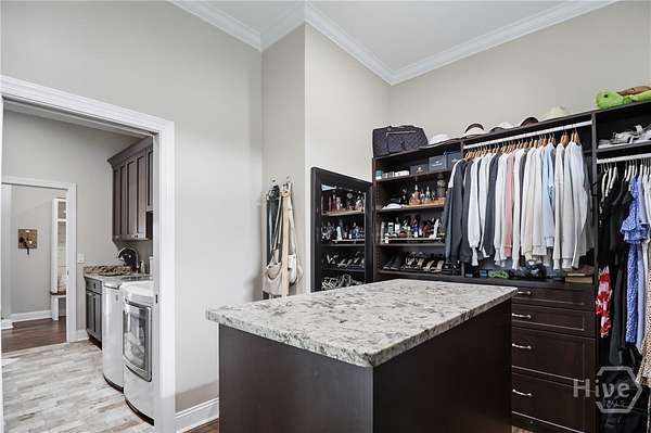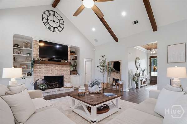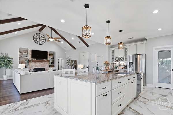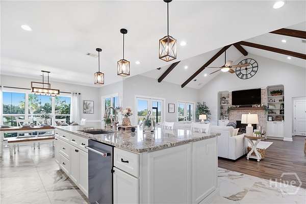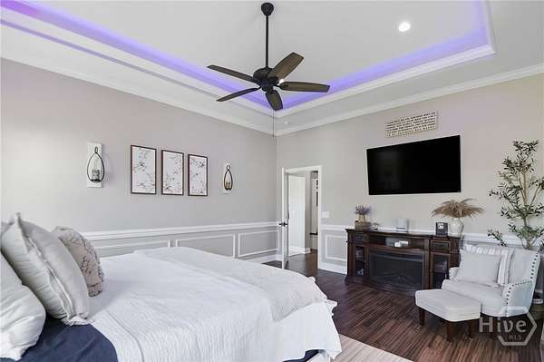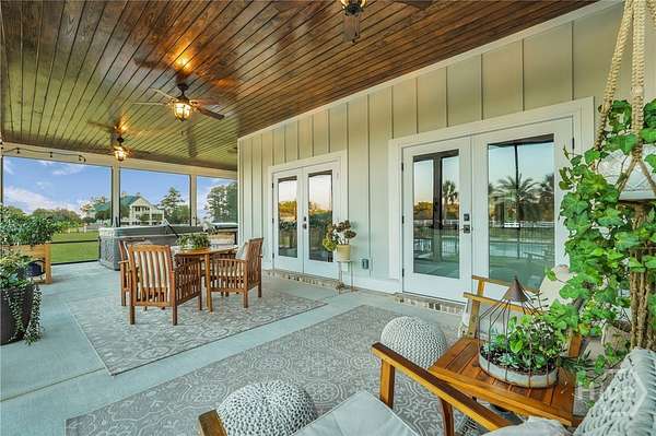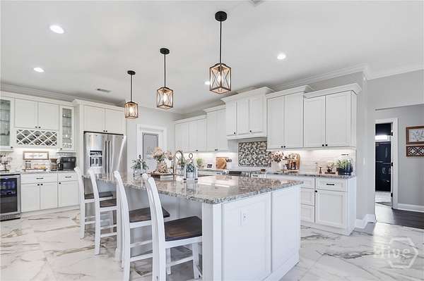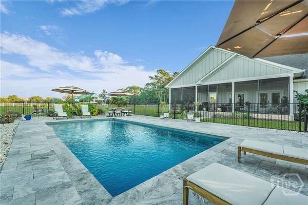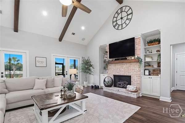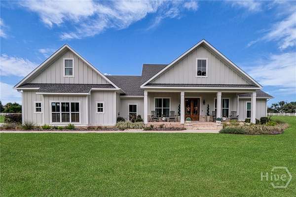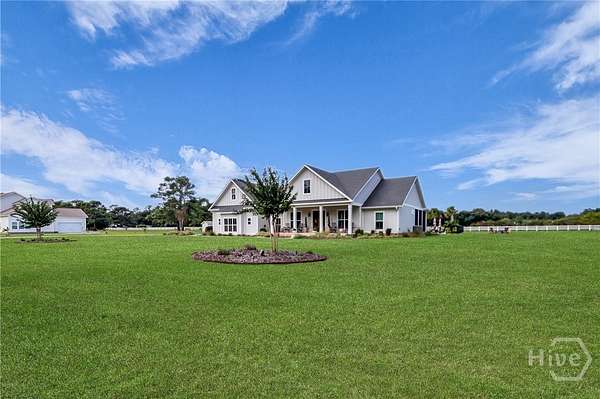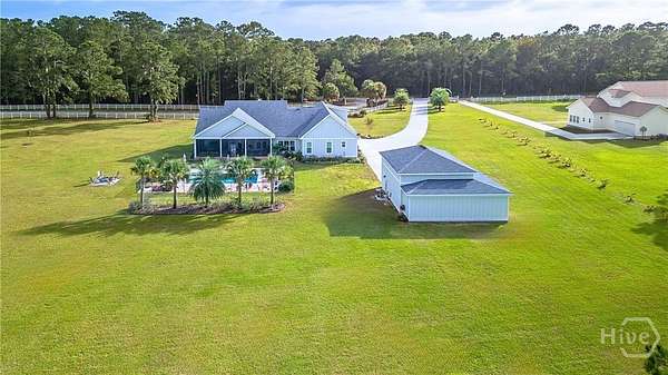 Experience refined coastal living in Midway, GA, where custom design meets resort-style luxury on 3.15 private acres. A grand foyer opens to an open-concept living space with built-in surround sound and a propane fireplace. The chef's kitchen impresses with a large island, walk-in pantry, and coffee bar, flowing into the dining and living areas. The primary suite is a spa-caliber retreat with an oversized soaking tub, dual showerheads, shower jets, double vanity, and custom closet shelving. Upstairs, a 400 sq. ft. bonus room with private bath offers flexibility for guests or a home office, while the massive attic allows for additional living space. Outside, unwind in a private oasis featuring a saltwater pool with three illuminated fountains, hot tub, fire pit, landscape lighting, and screened porch with mini kitchen-perfect for entertaining. A 10-zone WiFi irrigation system keeps the grounds lush year-round. The detached garage fits a 28-ft T-top boat, plus space for workout equipment, extra cars, and tool storage, and includes 400-amp electrical service. Every detail of this estate reflects luxury, craftsmanship, and timeless elegance.