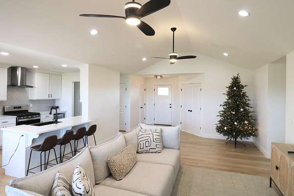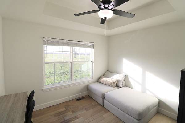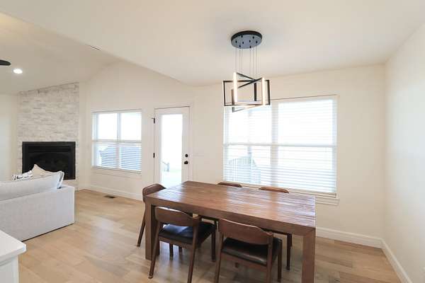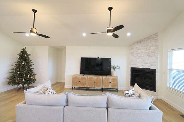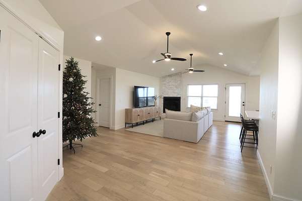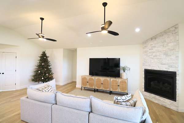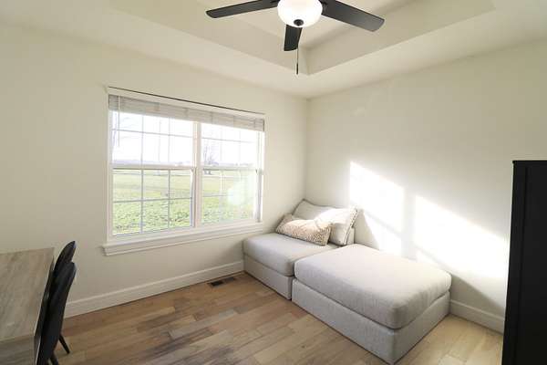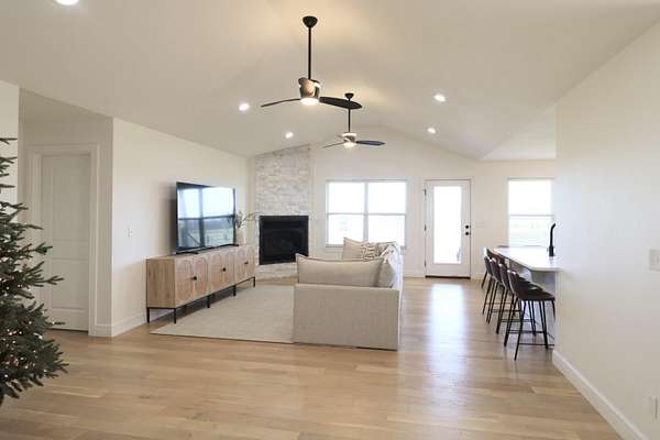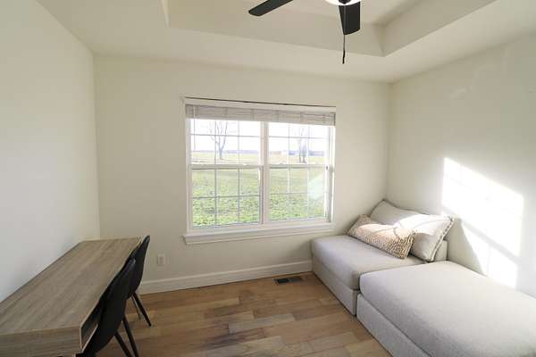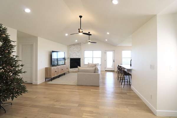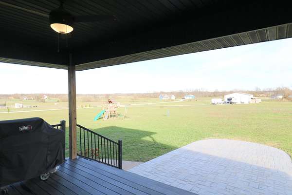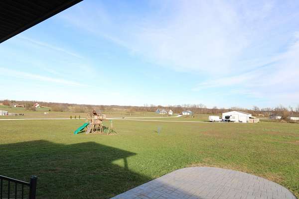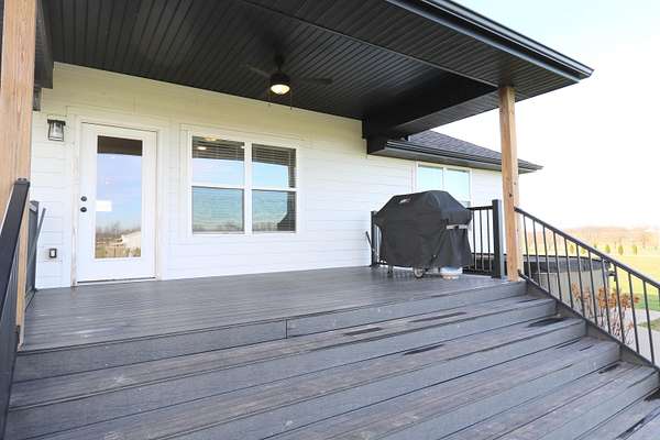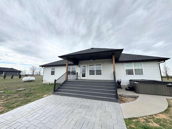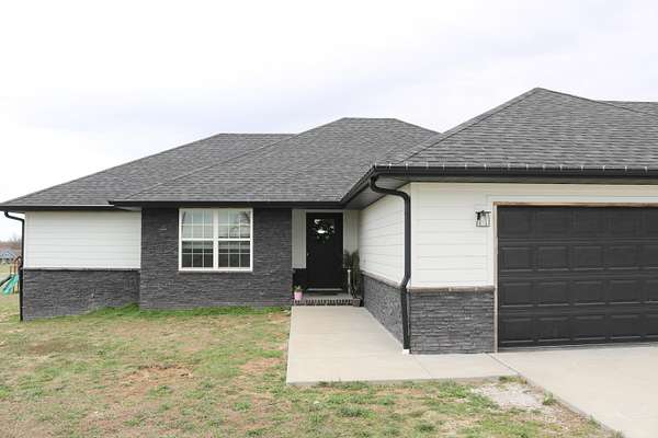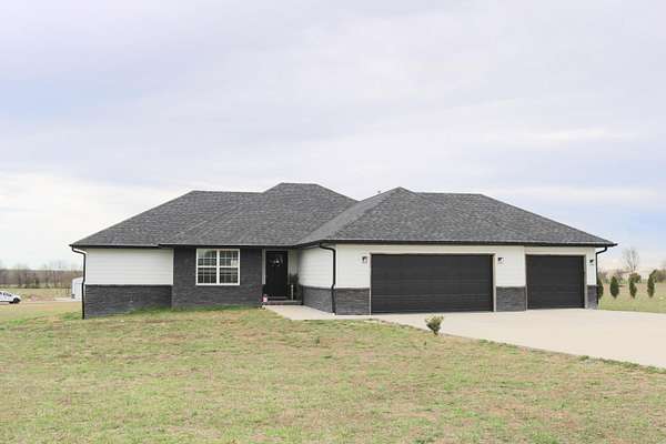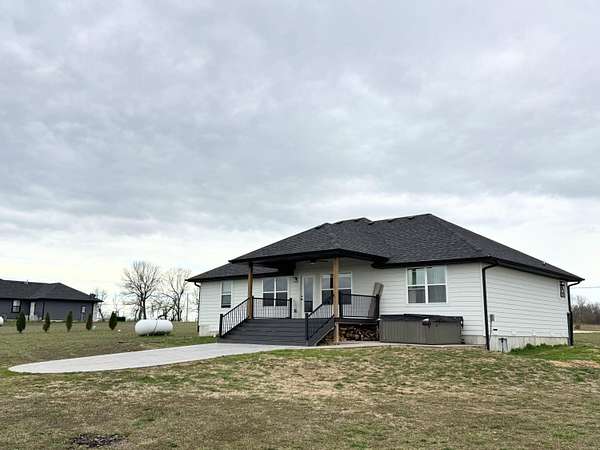 Newer Home, situated on a 5 acre level lot with panoramic views, on a beautiful private street with like homes! Get the best of both in a country setting with acreage yet close to town in the sought after Clever School District. The home features just under 1800 square feet of living space with a 3-party shared well, leased propane tank, propane heat and propane water heater. Quality construction with modern and trendy color palate, high end finishes and open floor plan. 3 bedrooms with 1 additional room featuring double doors which could be used as an office, entertainment room or a 4th bedroom. 2 bath split floor plan with 3-car garage and epoxy finished floors. The 3rd garage is separated by a wall, is fully finished w/vinyl flooring and is being used as a game room, but can be used as a separate bedroom, gym, craft room and so much more! Great room has a gas log fireplace, vaulted ceiling w/2 ceiling fans. Real Hardwood floors throughout. Wonderful and well thought out master suite with spa-like master bathroom featuring a tiled walk-in shower, soaker tub and extra large master walk-in closet with custom wood shelving. Spacious covered back deck made from durable lifetime materials which extends onto a beautiful paved fire-pit/patio/seating area. Playground included. Guest bathroom features a double vanity and a beautiful oversized tiled shower. In the back of the property you will find a large shop with can be used for anything imaginable. The large driveway is fully paved from the street to the garages.