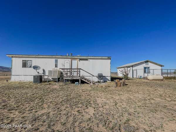 Looking for a 3-bedroom home in Chino Valley with land, views, and no HOA? This 1,300 square foot Palm Harbor home sits on 2.23 acres in Angus Acres, offering a level lot directly across from open State Land with panoramic views of Granite Mountain and the San Francisco Peaks. The property features a split floor plan with 2 full bathrooms, a detached 2 car garage, and full perimeter fencing. The setting provides the perfect blend of space and privacy with zoning that allows flexibility for personal or animal use. A private well and water storage tank are already in place, along with propane heating and a septic system. Located on a county maintained paved road, this quiet rural area offers the beauty of country living while remaining convenient to town amenities, schools, shopping, and Outer Loop access. A great opportunity for buyers seeking open space and peaceful surroundings in the Chino Valley area.