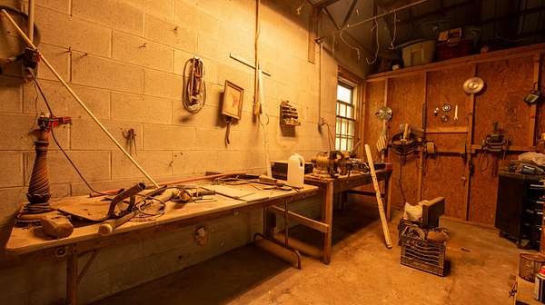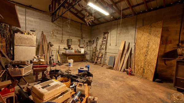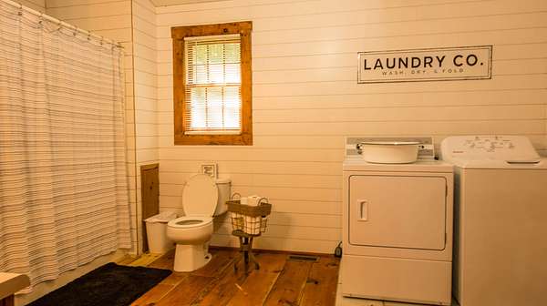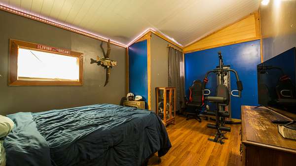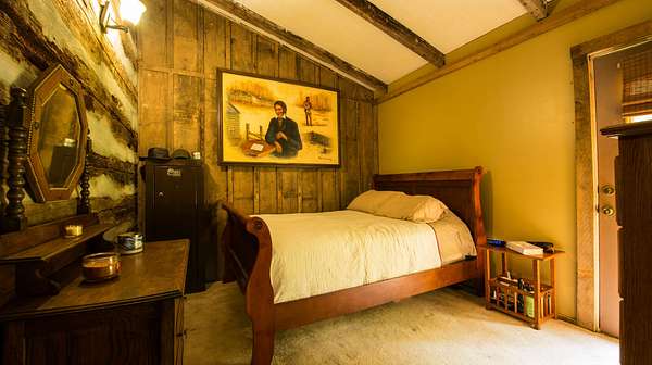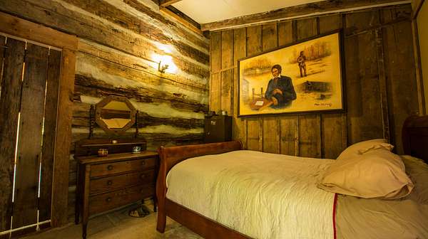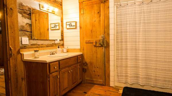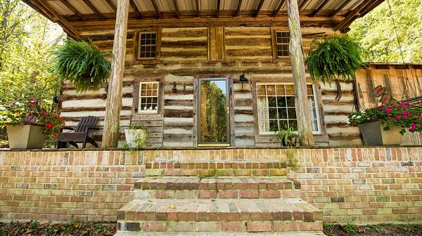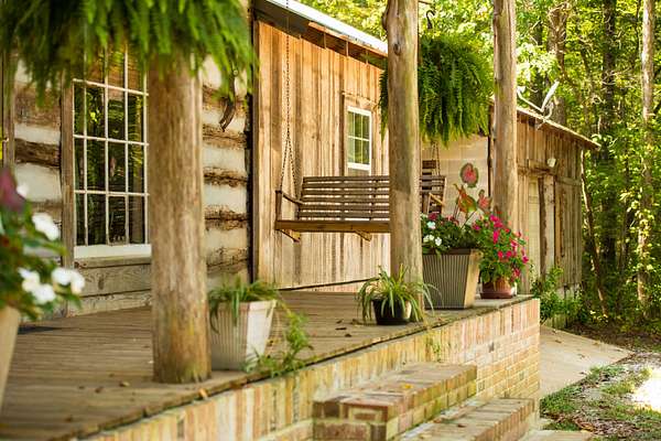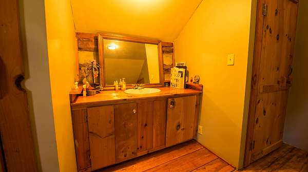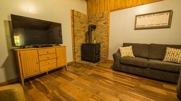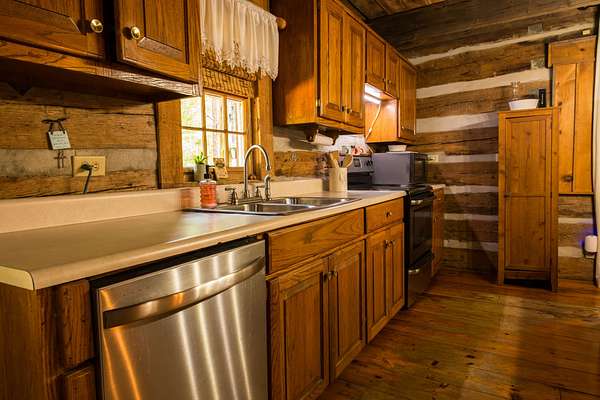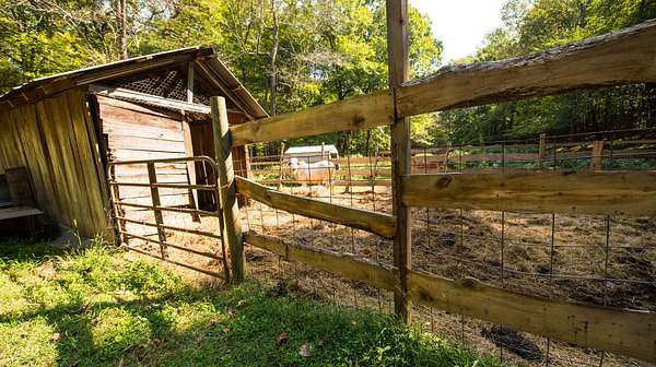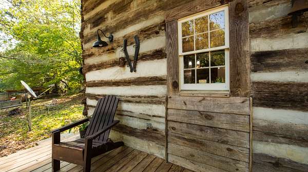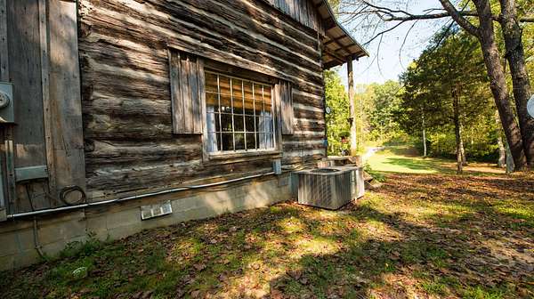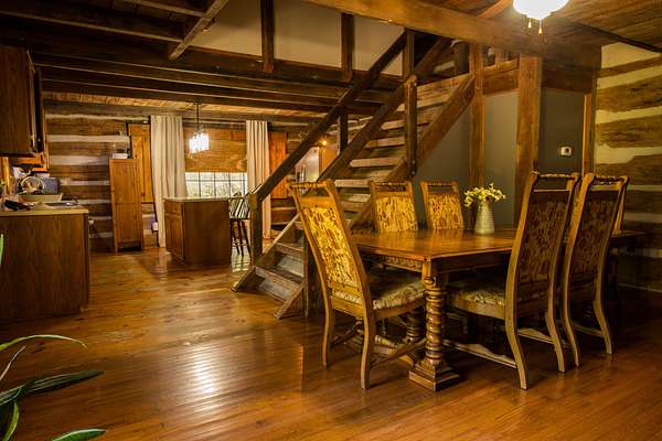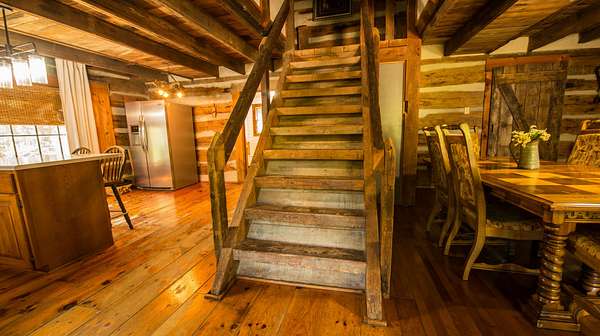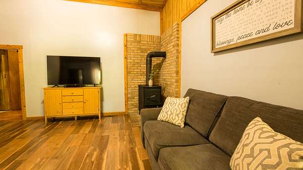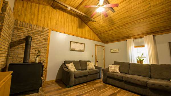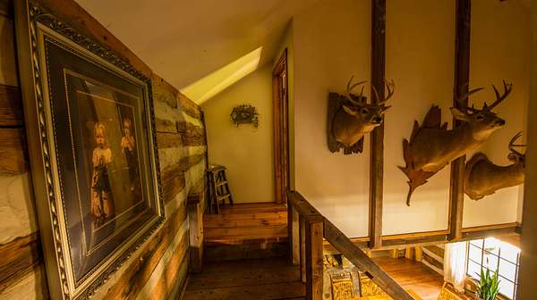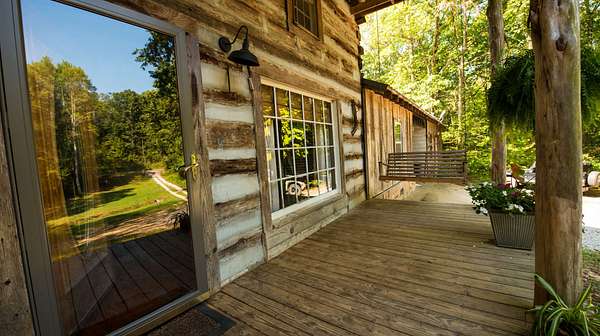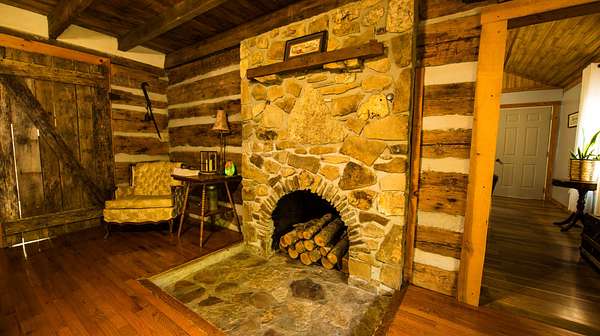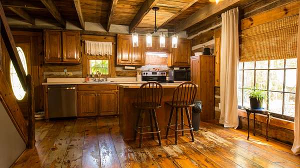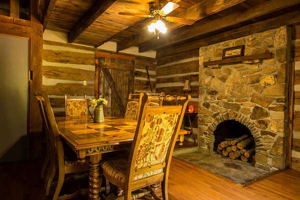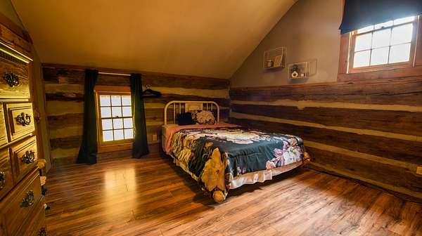 The centerpiece of the property is a cabin built from wood reclaimed from the 1800s, giving it a truly distinctive character. Inside, the cabin offers four bedrooms, one full bathroom, and one half bathroom. The kitchen provides a view of the front yard, and the dining area features a fireplace. A 2009 addition expanded the living room, creating extra space for gatherings. While the home has central heating, a wood-burning stove in the living room provides an alternative heat source.