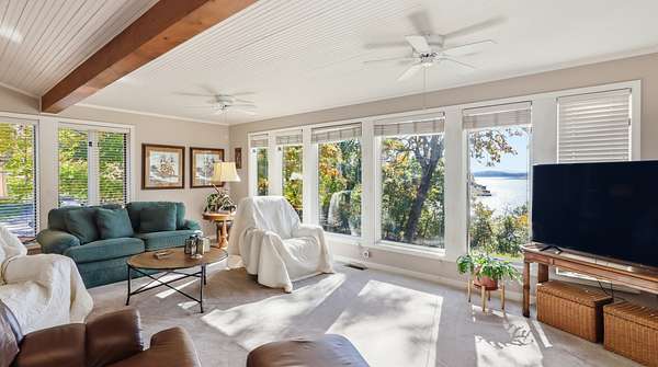 The moment you step inside, you're welcomed by expansive windows framing incredible lake vistas from both the main level and the fully finished walkout basement. Two cozy wood-burning fireplaces create the perfect ambiance for year-round enjoyment. Roof is less than 5 years old, in addition to exceptional upkeep, there are several updates throughout the home. The screened-in porch is outfitted with removable plexiglass windows and its own heat source, this adds valuable flexible living space for relaxing, dining, or simply taking in the peaceful surroundings.