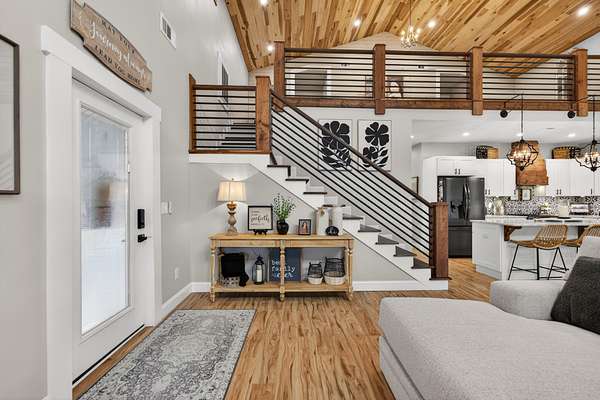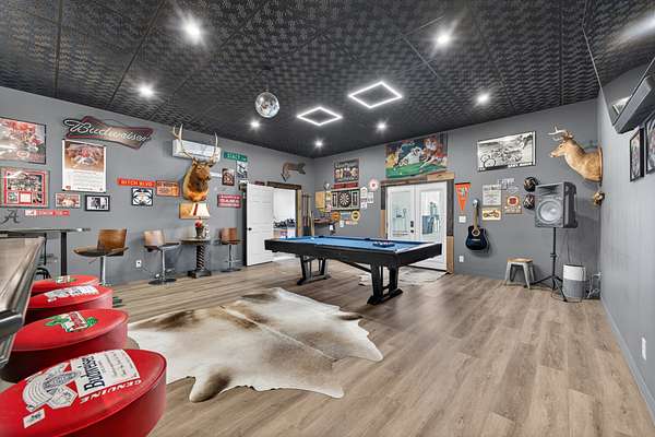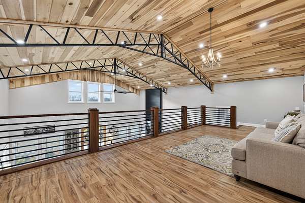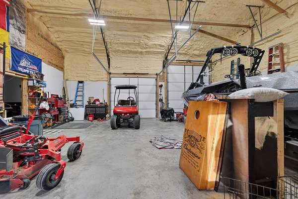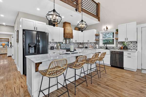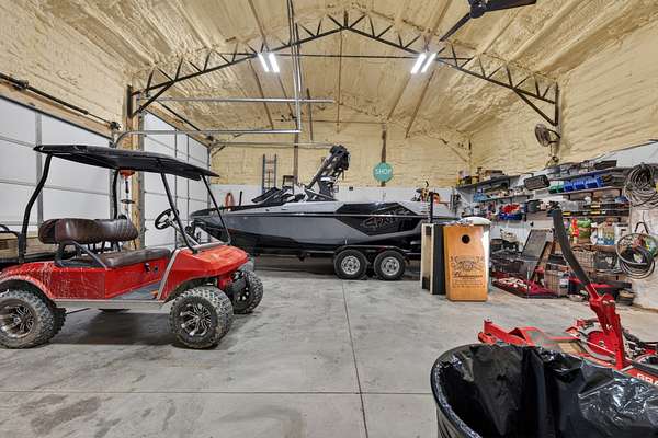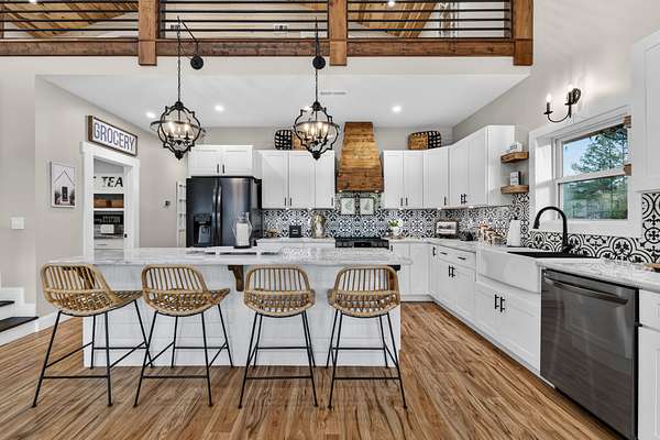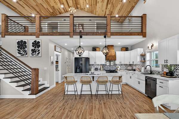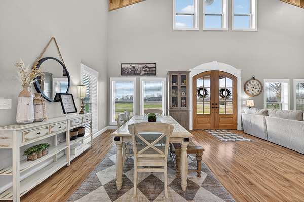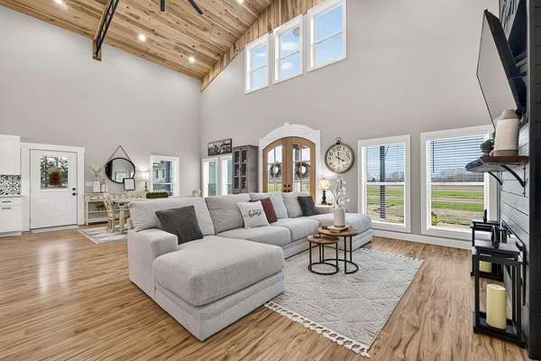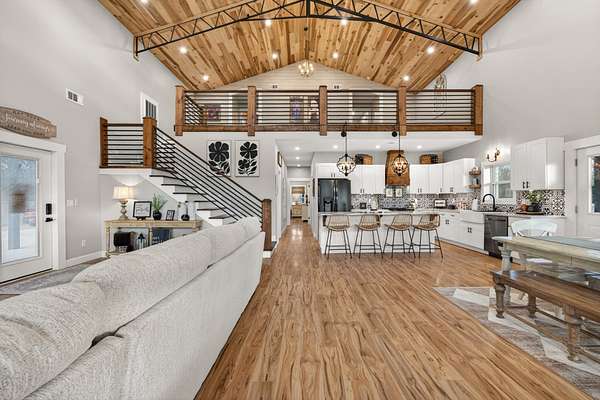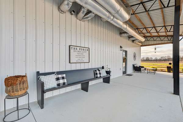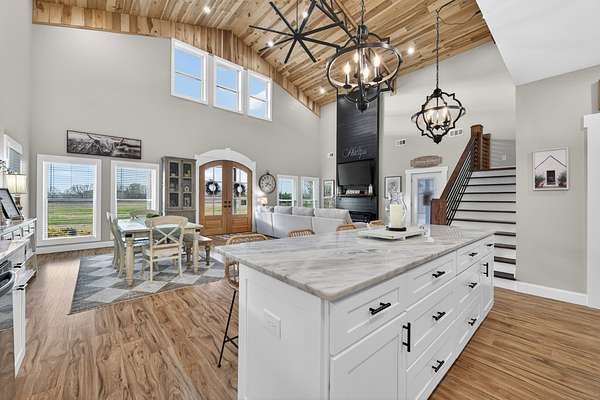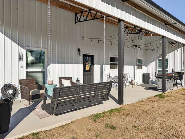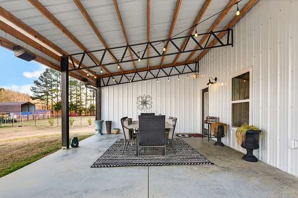 4-bedroom, luxury metal siding home set on nearly 3 acres of flat and useable land. This property features an insulated, climate-controlled shop with multiple bays, including 1 RV height, along with a second-level storage area. Also including under the same roof is an attached heated and cooled studio apartment/ office, currently used for entertaining, complete with a half bath, pet washing station, and storm shelter. Inside the home, you'll find soaring ceilings over a open living, kitchen, and dining area, creating a dramatic yet welcoming space ideal for both everyday living and entertaining. You will not want to miss the walk-in pantry complete with storage and coffee bar right off of the kitchen.The private owner's suite is thoughtfully isolated and includes an oversized walk-in closet with custom built-in shelving and a beautifully appointed bathroom. The 2nd story of the home features 2 bedrooms with a sitting area overlooking the main living spaces. In addition, the home offers a full mother-in-law suite / second owner's suite--all on the main level--featuring its own living area, spacious bedroom, walk-in closet, and private bath, perfect for multi-generational living or long-term guests. Step outside onto the homes multiple covered porches offering plenty of space and time for sitting, sipping and fun.