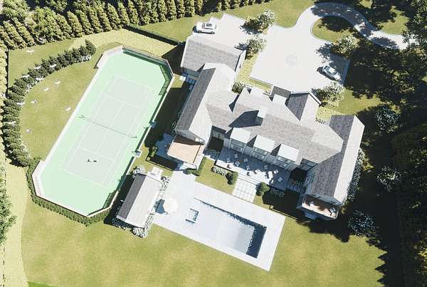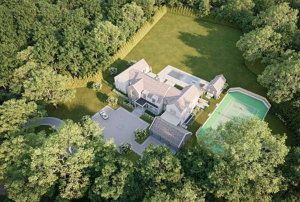 This masterfully designed estate from Paramount Development Group and architect Peter Cook blends classic Hamptons elegance with modern luxury for a complete lifestyle experience just minutes from ocean beaches and Bridgehampton Village. Sited on 2.4 pristine acres, the estate is a private paradise complete with 10,586 +/- sq. ft. on three floors with 7 bedrooms, 8 full baths, 3 half baths, 3-car garage, elevator, gunite pool and spa, and sunken tennis court. The home features a grand first-floor layout that includes a spacious great room, a formal dining room, an oversized kitchen with dual sinks, a large island, a separate service kitchen, and an adjacent family room. Also on the main level is a luxurious primary suite with a pair of closets, a spa-like bath with double vanity, and access to a covered porch. A guest suite also opens to the covered outdoor space. Also on this level are two half baths, large pantry, laundry room, mudroom with closet, and a 3-car garage. Upstairs, a second primary suite has a private office, dual closets, private balcony, and a stunning bath complete with soaking tub, shower, double vanity, and dual water closets. Three additional ensuite guest bedrooms provide comfort and privacy, one of which also enjoys its own balcony. A sitting room, linen closet, and elevator complete the upper level. The walkout lower level is dedicated to wellness, offering a fully equipped gym, cold plunge, steam room, sauna, and meditation area. For entertaining, there is a media room and large bar area. Two additional ensuite bedrooms get great natural light. There is also a media room and a large bar area for entertaining. Past the gym, a large walkout area leads to a gorgeous outdoor space. Outdoors, the estate offers a resort-caliber experience with a 20'x50' heated gunite pool, integrated 8'x8' spa, a 14'x29' pool house, and a pergola-covered entertaining area. Expansive covered porches wrap around two sides of the home for seamless indoor-outdoor living. A sunken 56'x121' tennis court enhances the private compound feel. The roof is pitched and ready for a rooftop deck and includes solar panels for sustainability. This one-of-a-kind Bridgehampton estate is a rare opportunity to own a fully realized Hamptons retreat with every amenity in place.