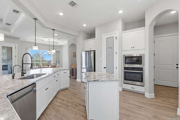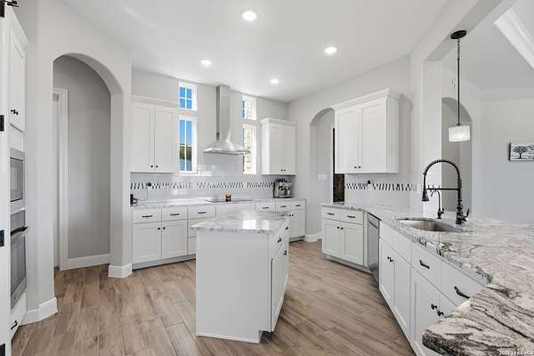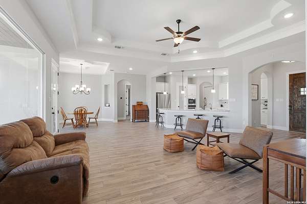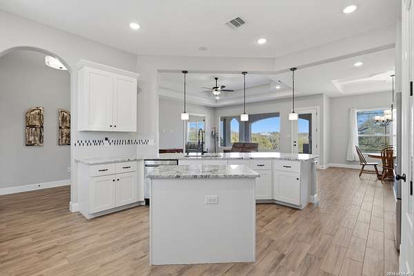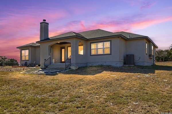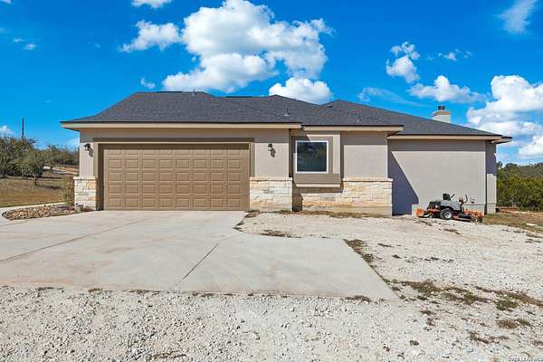 Experience refined Hill Country living and unparalleled privacy behind a private gated entry. This fully fenced 3-acre sanctuary, cleared and perfectly prepped for an additional shop, garage, or custom outbuilding, sets the stage for this stunning custom home. Designed for both comfort and entertaining, the open-concept layout features soaring ceilings, expansive windows, and a seamless flow between the living, dining, and chef's kitchen with an oversized island and abundant cabinetry. The private primary suite offers a spa-like retreat with a soaking tub, walk-in shower, dual vanities, and generous closet space. Secondary bedrooms are thoughtfully positioned with well-appointed baths and flexible living areas for a media room, office, or play space. Step outside to a covered patio with a stone fireplace and breathtaking views-perfect for relaxing or hosting year-round. This exceptional property blends modern elegance, functional design, and serene Hill Country living in the heart of Spring Branch.