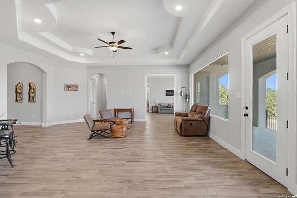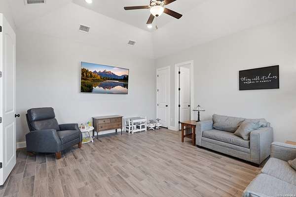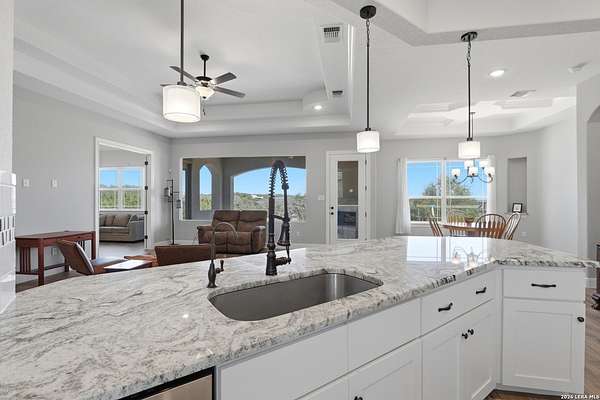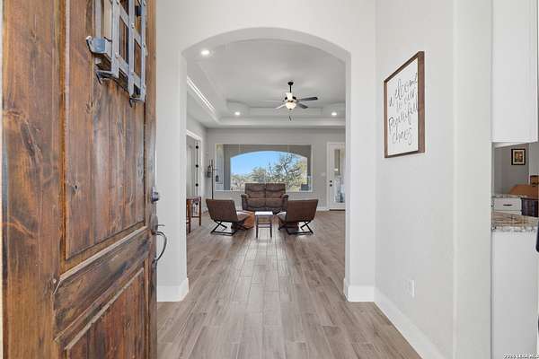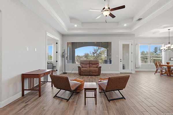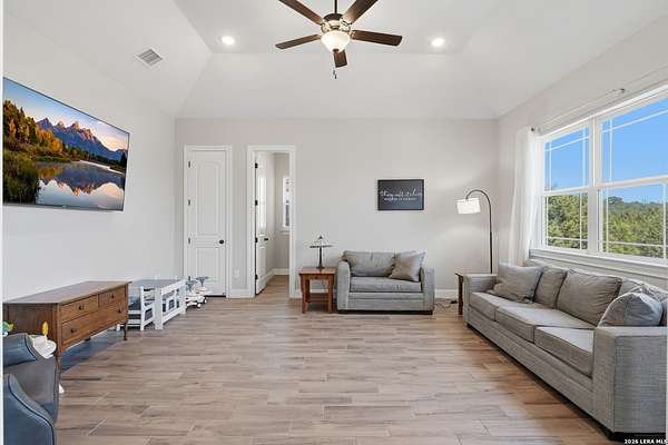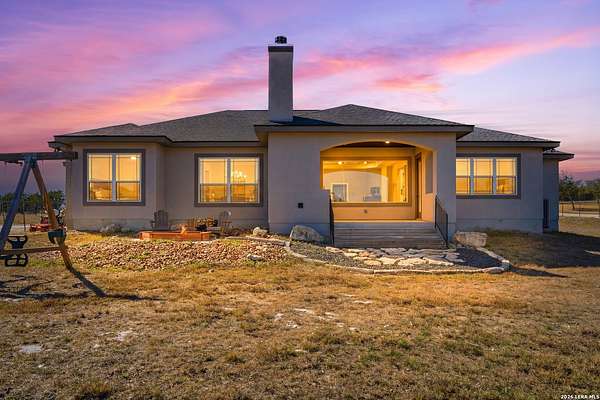 Experience refined Hill Country living and unparalleled privacy behind a private gated entry. This fully fenced 3-acre sanctuary, cleared and perfectly prepped for an additional shop, garage, or custom outbuilding, sets the stage for this stunning custom home. Designed for both comfort and entertaining, the open-concept layout features soaring ceilings, expansive windows, and a seamless flow between the living, dining, and chef's kitchen with an oversized island and abundant cabinetry. The private primary suite offers a spa-like retreat with a soaking tub, walk-in shower, dual vanities, and generous closet space. Secondary bedrooms are thoughtfully positioned with well-appointed baths and flexible living areas for a media room, office, or play space. Step outside to a covered patio with a stone fireplace and breathtaking views-perfect for relaxing or hosting year-round. This exceptional property blends modern elegance, functional design, and serene Hill Country living in the heart of Spring Branch.