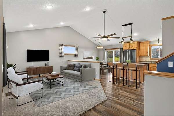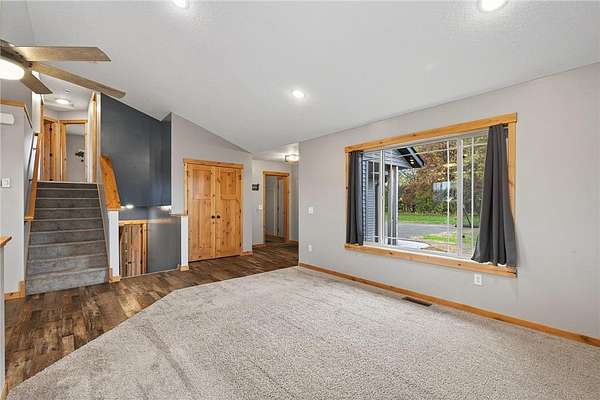 This attractive home sits on 2.5 acres with open views and nearby tree lines, offering plenty of space and privacy. Built in 2021, modern construction, practical design, and room to grow make this property stand out. An open layout with vaulted ceilings creates an airy, spacious feel on the main floor. LVP flooring extends throughout the living areas, paired with knotty alder trim and solid, paneled doors. Large windows and patio doors bring in abundant natural light and showcase views of the surrounding property.