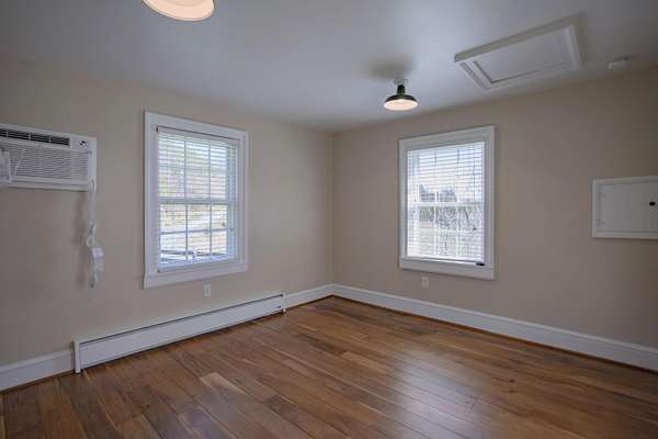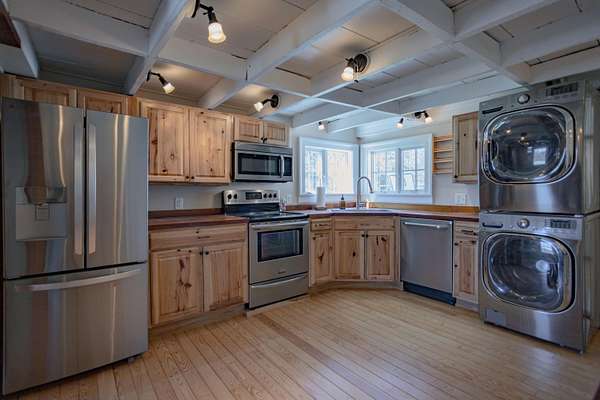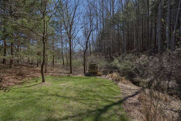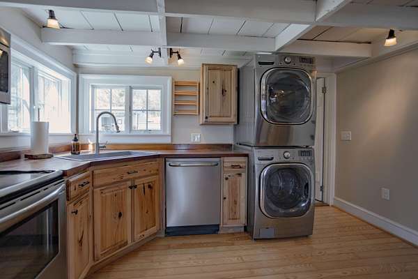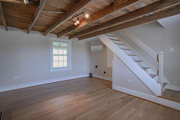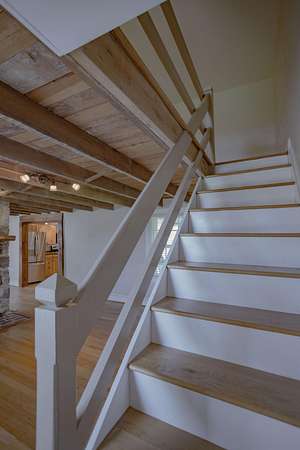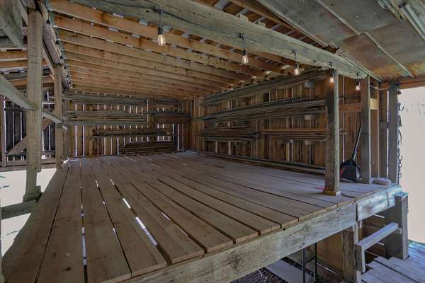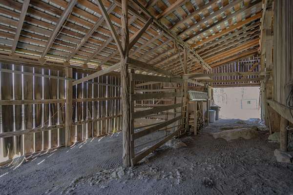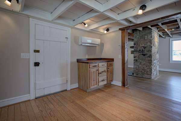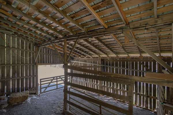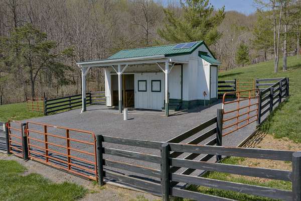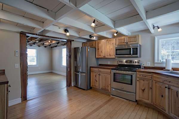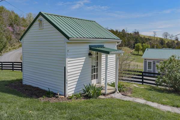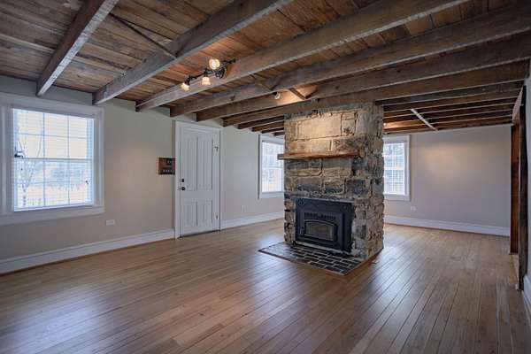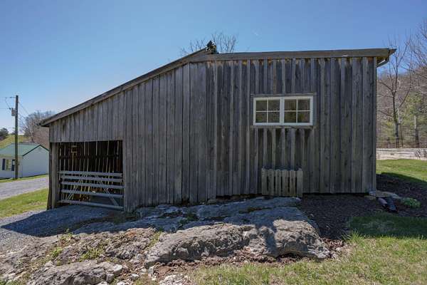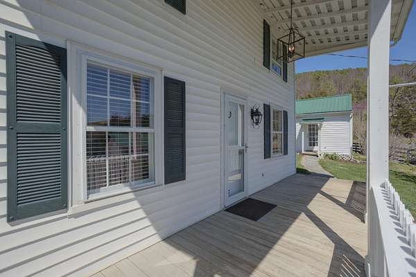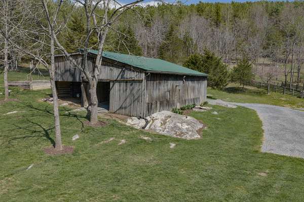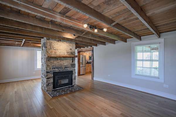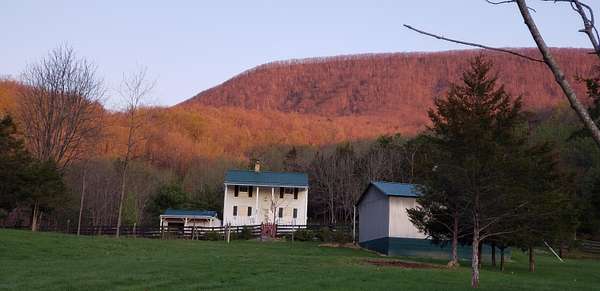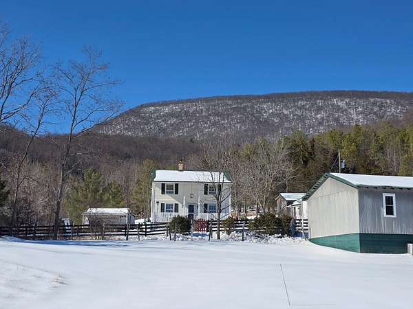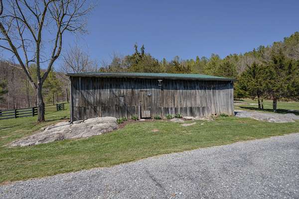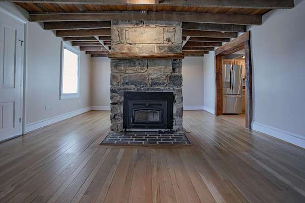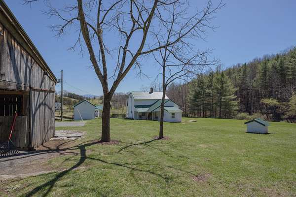 Picturesque small mountain farm tucked away on quiet country road offers a rare blend of historic character, modern updates, and functional farm infrastructure set on 5.348 acres. Originally dating to the 1890s, the home has been thoughtfully renovated with updates to all major systems, including wiring, plumbing, roofing, insulation, and HVAC. Character-defining interior elements provide exceptional charm, including oak and pine floors, walnut inlay surrounding a native stone fireplace with wood stove insert, and exposed ceiling joists showcasing original floorboards and sawn lumber. A beautifully updated kitchen offers high-end amenities with hickory cabinetry, wood countertops, and stainless appliances.