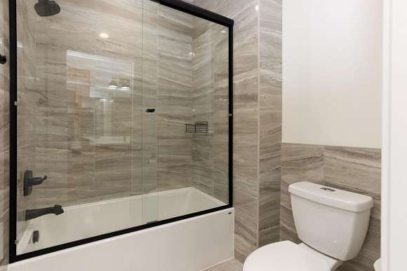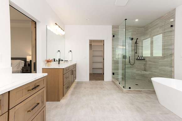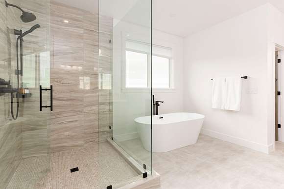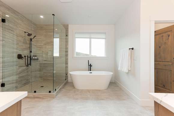 - Built-In Features, Ceiling Fan(s), Double Vanity, Granite Counters, Kitchen Island, Linen Closet, Open Floorplan, Primary Downstairs, Shower/Tub Combo, Smart Thermostat, Soaking Tub, Solid Surface Counters, Stone Counters, Tile Shower, Vaulted Ceiling(s), Walk-In Closet(s), Wet Bar