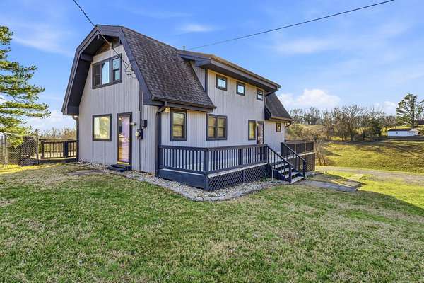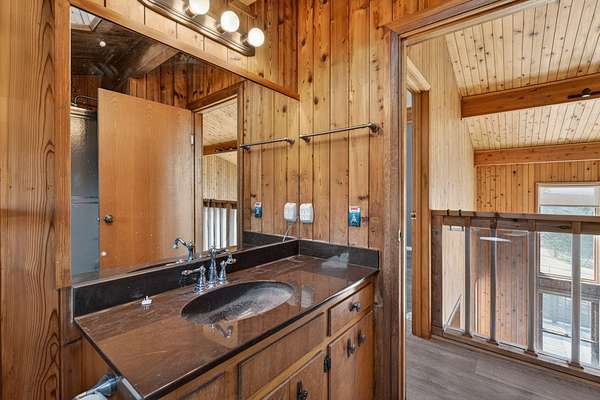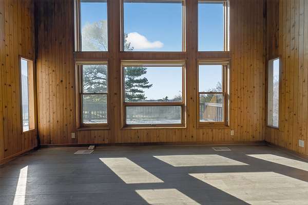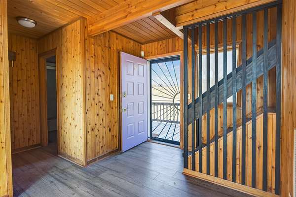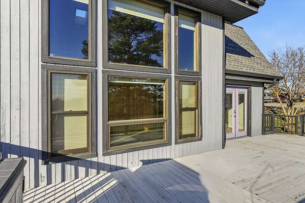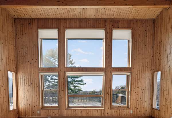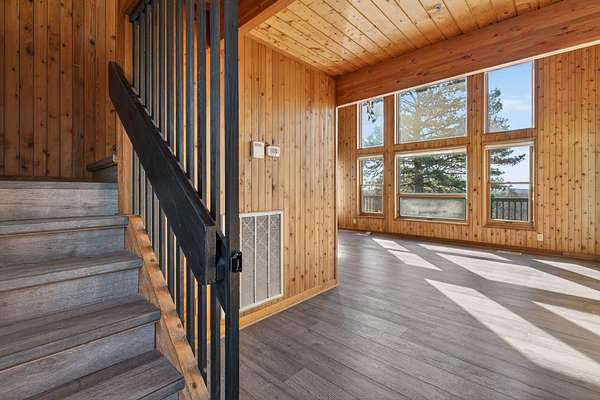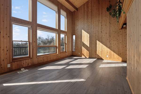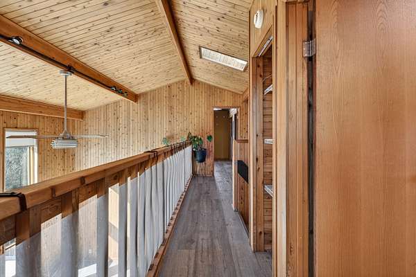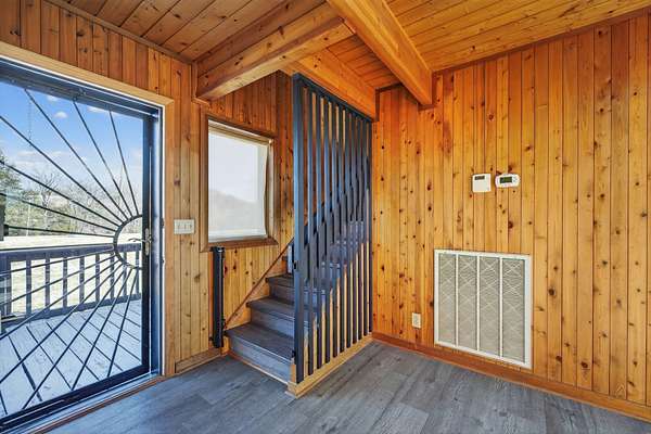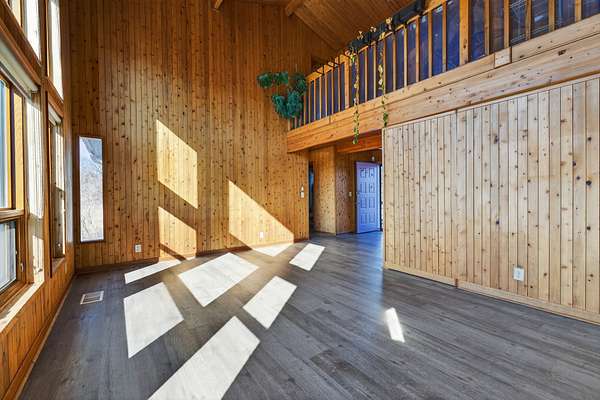 Spacious front and back decks invite you to step directly into nature. Inside, soaring ceilings and massive windows flood the home with abundant natural light, creating a bright, open feel. A modern staircase ascends to an interior balcony that overlooks the living area below.