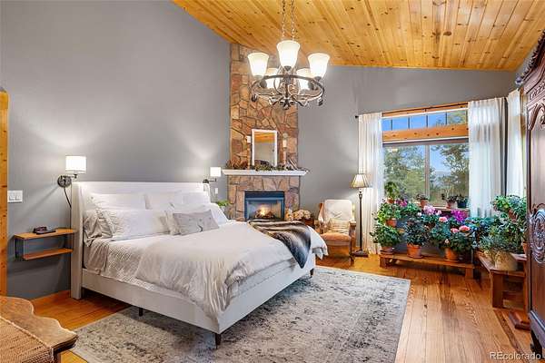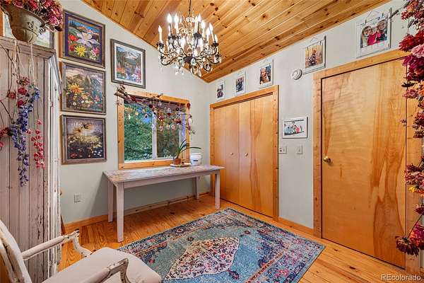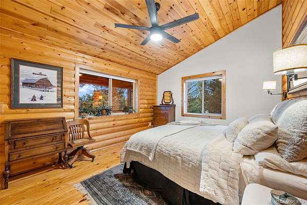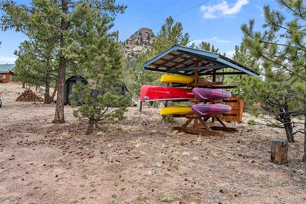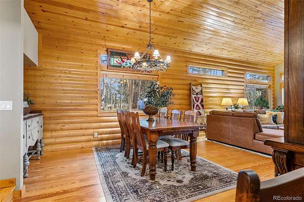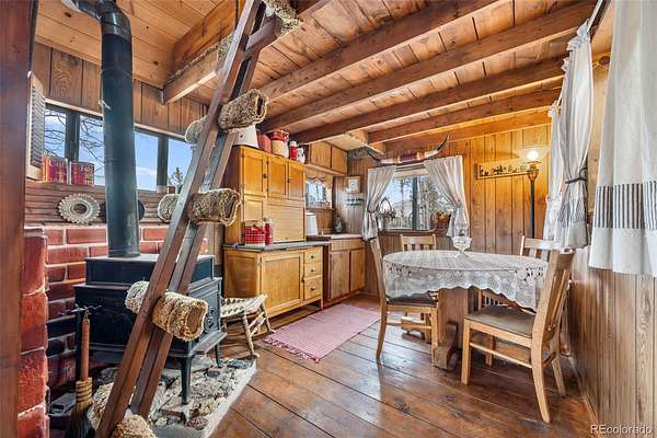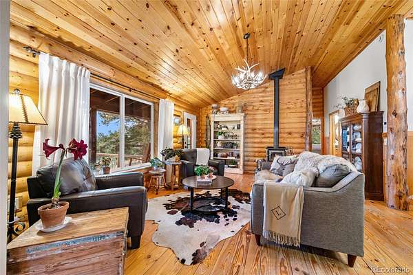 Tucked into a private mountain setting at the base of Crystal Peak with sweeping views, this beautifully crafted home offers the warmth and character of true Colorado living with no HOA. Inside, you’ll find extensive knotty pine finishes throughout, from vaulted tongue-and-groove ceilings to solid wood flooring, creating a cohesive and inviting mountain aesthetic. The kitchen is a standout feature, showcasing custom knotty pine cabinetry with distinctive burled wood accent panels, granite countertops with a chiseled edge, and a functional layout centered around a spacious island. Radiant in-floor heating in the kitchen adds comfort and efficiency, while newer windows bring in natural light and highlight the craftsmanship. The main living spaces are designed for comfort and gathering, featuring both a gas fireplace and a wood stove for year-round warmth and ambiance. The stone fireplace serves as a beautiful focal point with natural variation, a substantial hearth and mantel that enhance the home’s mountain feel. Built with durability in mind, the property includes 2x6 construction with foam block insulation and a metal roof installed just two years ago. The primary suite offers a peaceful retreat with its own fireplace and serene views, while the bathrooms blend rustic and modern elements with quality finishes throughout. Step outside to enjoy the wood and Trex deck and take in the surrounding landscape. The thoughtfully curated landscaping reflects pride of ownership, complemented by two greenhouses and a fenced yard area ideal for pets or added versatility. The land offers a unique lifestyle experience, including a zip line, a custom-built play deck with swings, and absolutely charming guest quarters with a loft. The home may be offered furnished for a seamless move-in experience. To experience this home through the seasons, be sure to explore the virtual/photo tour.