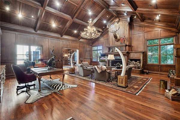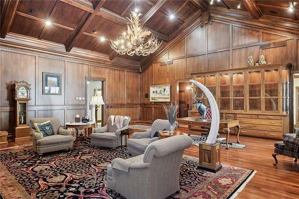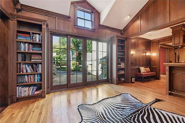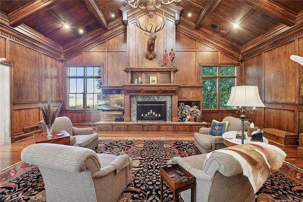 For those who love to entertain, the formal dining room comfortably accommodates large gatherings and includes a custom bar. The vaulted library extends to a front patio, while the great room, also featuring vaulted ceilings, showcases built-in shelves and a fireplace, all elegantly adorned in rich Black Walnut.