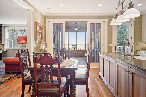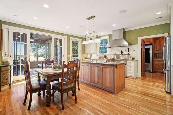 The spacious kitchen is a culinary dream, equipped with a centrally located island, a Butler's Pantry for ample storage, and an additional refrigerator/freezer, making it ideal for casual dining. The cozy family room, anchored by a gorgeous stone fireplace, provides the perfect retreat for relaxation. The welcoming entryway features a delightful front porch and a spacious area for coats and shoes, complete with a practical farm sink for effortless cleanup.