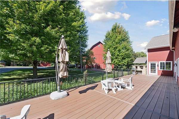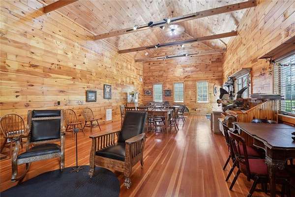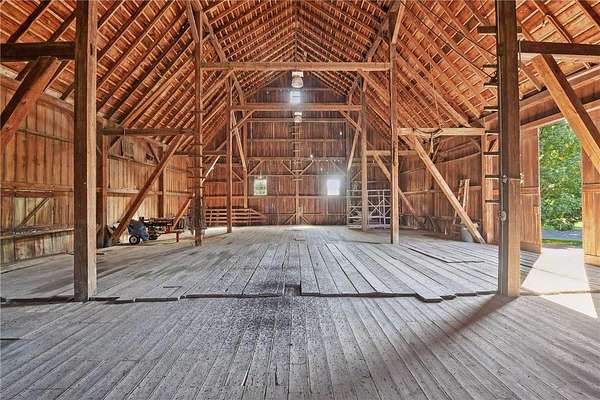 Outside, the extraordinary Party Barn is designed for events of any scale, complete with a lofted bunk area and a full kitchen. The vaulted main area ensures plenty of space for various activities, while the charming old dairy barn provides additional room for entertaining. The upper level is perfect for hay storage and includes a fun rope swing. Additional outbuildings include a corn crib, a pump house, and a sugar shack for maple syrup production. A detached, heated, and insulated triple garage offers ample storage and workspace.