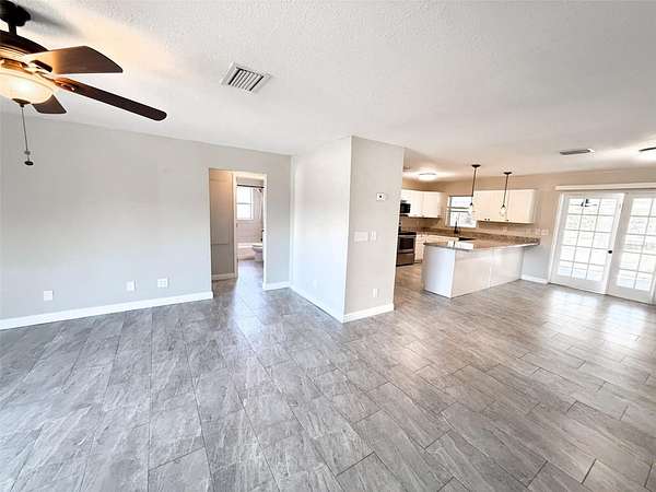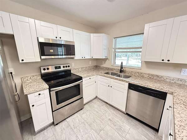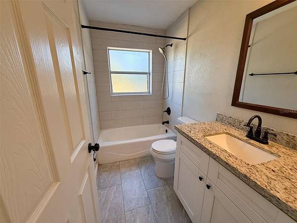 Inside, the home has been tastefully updated with modern tile flooring throughout, a BRIGHT OPEN-CONCEPT LAYOUT, and a REMODELED KITCHEN complete with GRANITE COUNTERTOPS, STAINLESS STEEL APPLIANCES, and WHITE SHAKER CABINETS. Each bathroom features stylish tilework and updated fixtures for a fresh, contemporary feel.