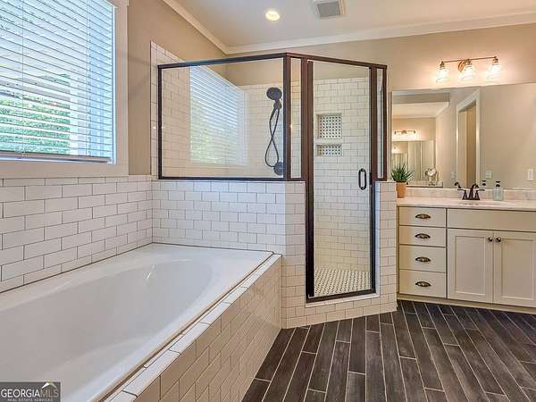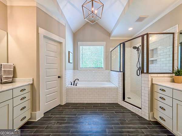 - Beamed Ceilings, Double Vanity, High Ceilings, Master On Main Level, Separate Shower, Tile Bath, Tray Ceiling(s), Vaulted Ceiling(s), Walk-In Closet(s)