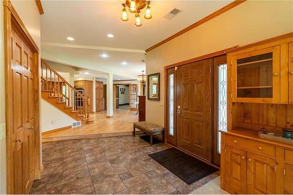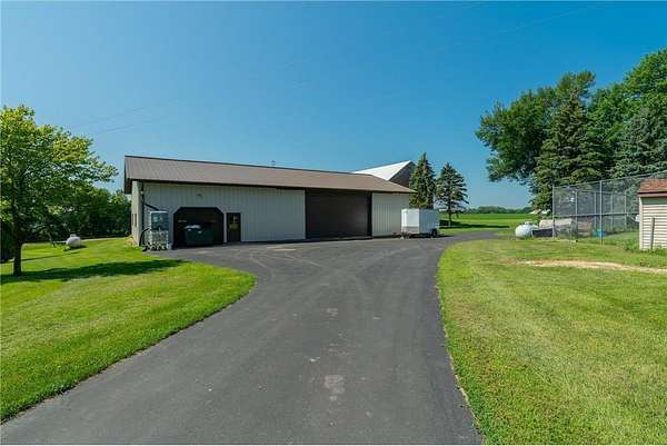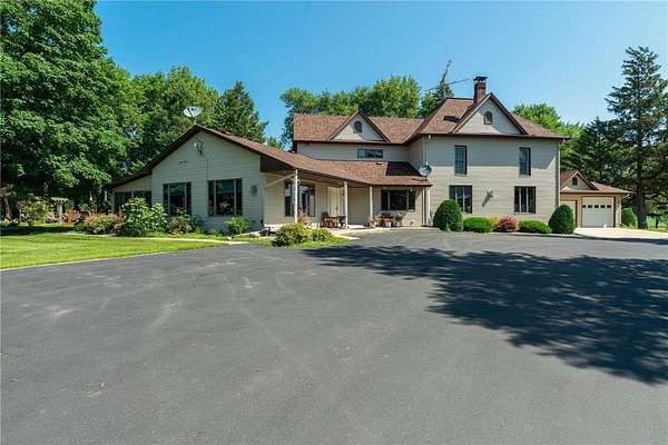 Dreaming of your paradise property?! This is it! Tucked into an absolutely picturesque setting with a tree-lined drive on 8+ acres offering landscaped sitting areas amongst the trees, gardens, and rolling lawn. This sprawling property with over 3800 square feet of living space must be seen to be truly appreciated. A spacious foyer welcomes you; to the left is the main living room w/pellet stove and a 4-season porch that takes you to the backyard. To your right is the dining room, kitchen with large center island w/granite & gas cooktop. Off the kitchen you access a covered deck, aggregate patio, and a landscaped fire pit. Also on the main floor is a thoughtfully designed laundry room & pantry with ample storage and functionality, 3/4 bath & hot tub room. A craftsman-style living room with brick FP, rustic beams, cabinets & more make this an ideal place for gathering. The main-floor primary bedroom connects to a full bath with separate shower & tub + dual sinks and has a large walk-in closet. Head on up the main stair case and the 2nd floor brings 3 additional bedrooms, a full bath, and two rooms of closets and space for a playroom/craft area/reading nook...endless options to utilize it! Above the kitchen is the 5th bedroom (or nifty game room and bar) with 1/2 bath. The attached garage is heated with a 3rd overhead stall, great for toy storage, plus a framed out area that is currently used for workout space. A 45' x 72' shop with concrete floors and automatic overhead doors is perfect for just about any set-up. This includes finished space for a heated workshop, and open space for vehicle/equipment storage. A barn and granary (both with steel roofs) are a sign of the property's history, and are in nice condition. Add a paved basketball court, garden, patio, gorgeous views all around, and you've got your dream site! With compliant septic and numerous updates throughout, including steel siding, new 50-year roof (with transferable warranty) on the house, steel roofs on the outbuildings (2023), new pressure tank in well (2024), solid doors throughout the house, you'll appreciate the care that has gone into this property.