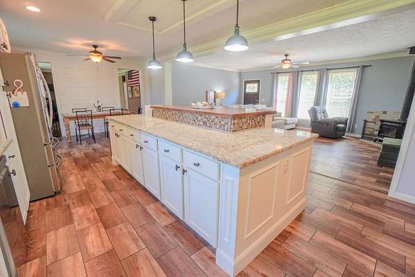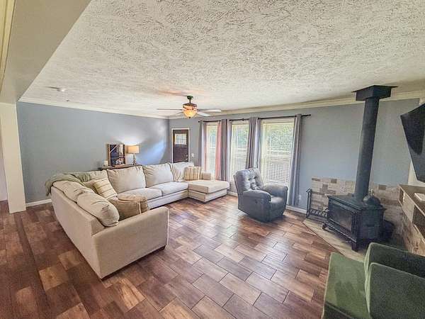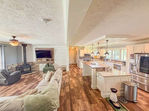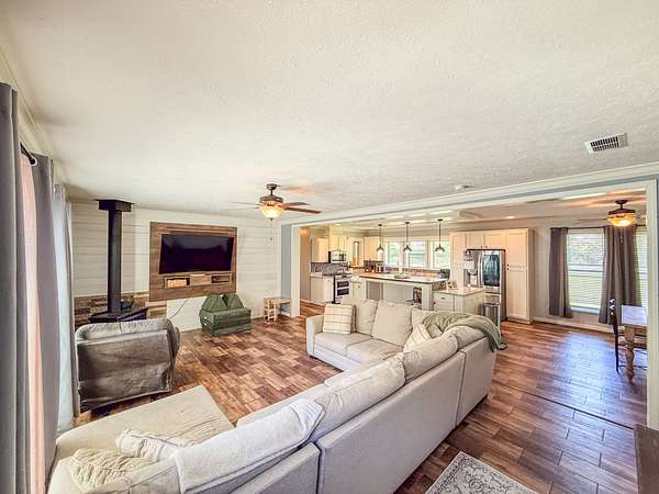 Cozy Living Room: Enjoy cozy evenings by the wood-burning stove in the expansive living room, perfect for family gatherings.