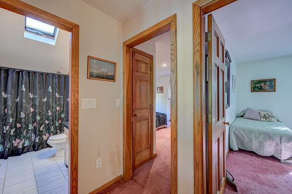 Welcome to the White Mountains! This charming contemporary 3-bedroom, 3-bath home features a 2-car garage plus a 1-car detached garage with a spacious workshop, sitting on 1.68 acres and perfectly blending comfort with mountain living. The main level welcomes you with a stunning cathedral-ceiling living and dining area, where floor-to-ceiling windows fill the space with natural light and a pellet stove adds warmth and ambiance. A sliding door opens to an expansive deck, ideal for outdoor entertaining or quiet mornings with a cup of coffee. The well-appointed kitchen boasts stainless steel appliances, abundant cabinetry, and generous counter space, complemented by a convenient laundry area, half bath, and a bright glass-enclosed porch. The spacious primary suite offers dual closets and a spa-like bath with an oversized jacuzzi tub beneath double skylights and a separate shower, along with a private slider to its own sun-filled deck. Upstairs, two additional bedrooms share a full bath, while the lower level provides a versatile bonus room and a cozy man cave with a pellet stove, along with direct access to the 2-car drive-under garage. Perfectly located in Mount Washington Valley, this home offers easy access to incredible ski areas, endless hiking trails, kayaking on the Saco River, and a host of outdoor adventures. This property is a true four-season retreat that captures the quintessential White Mountains lifestyle.